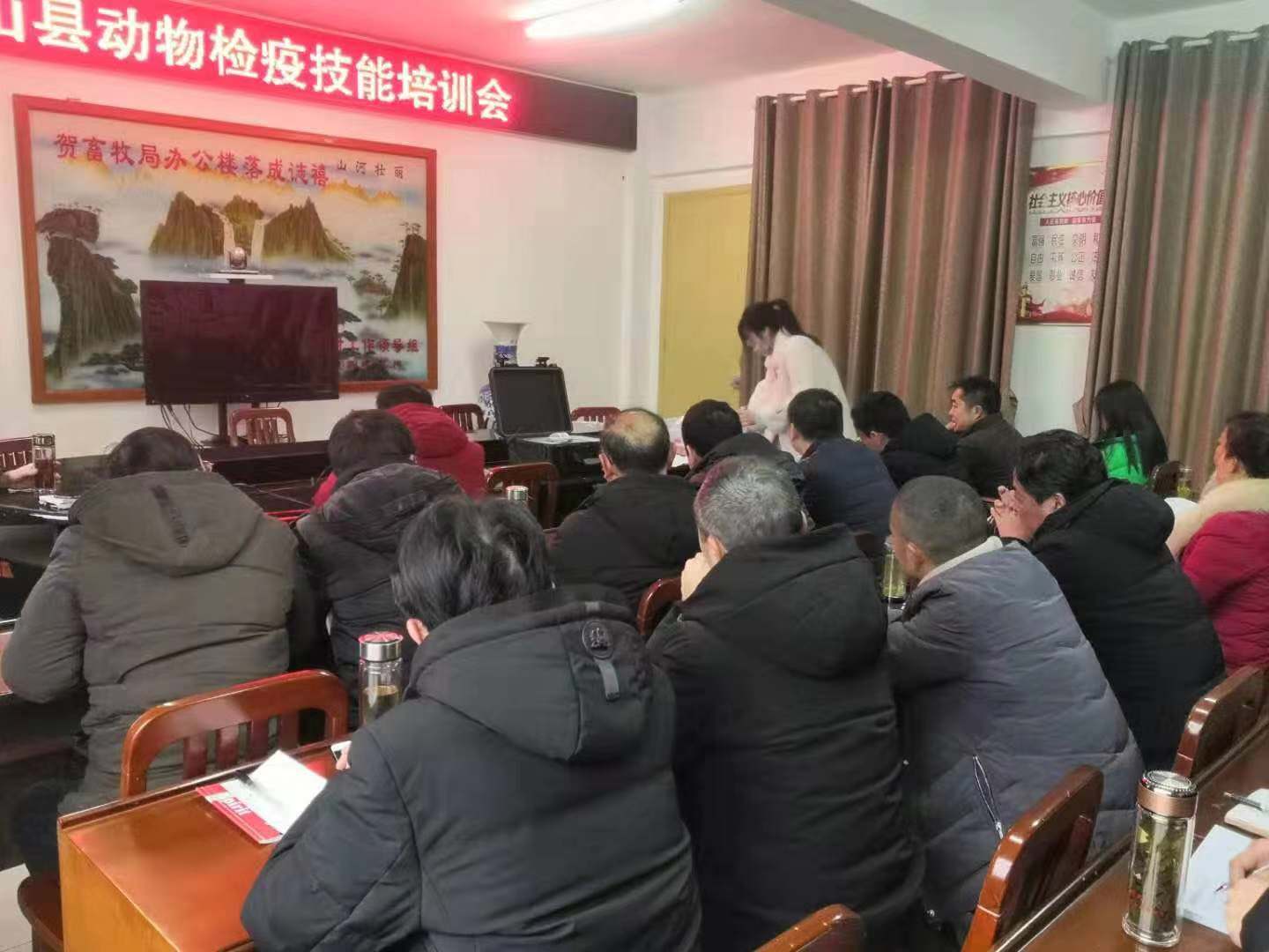 19年,河南省信陽(yáng)市光山縣畜牧局,采購(gòu)16臺(tái)獸藥殘留檢測(cè)儀 16臺(tái)瘦肉精檢測(cè)儀,我公司吳連娟在客戶現(xiàn)場(chǎng)進(jìn)行動(dòng)物檢疫技能培訓(xùn)。