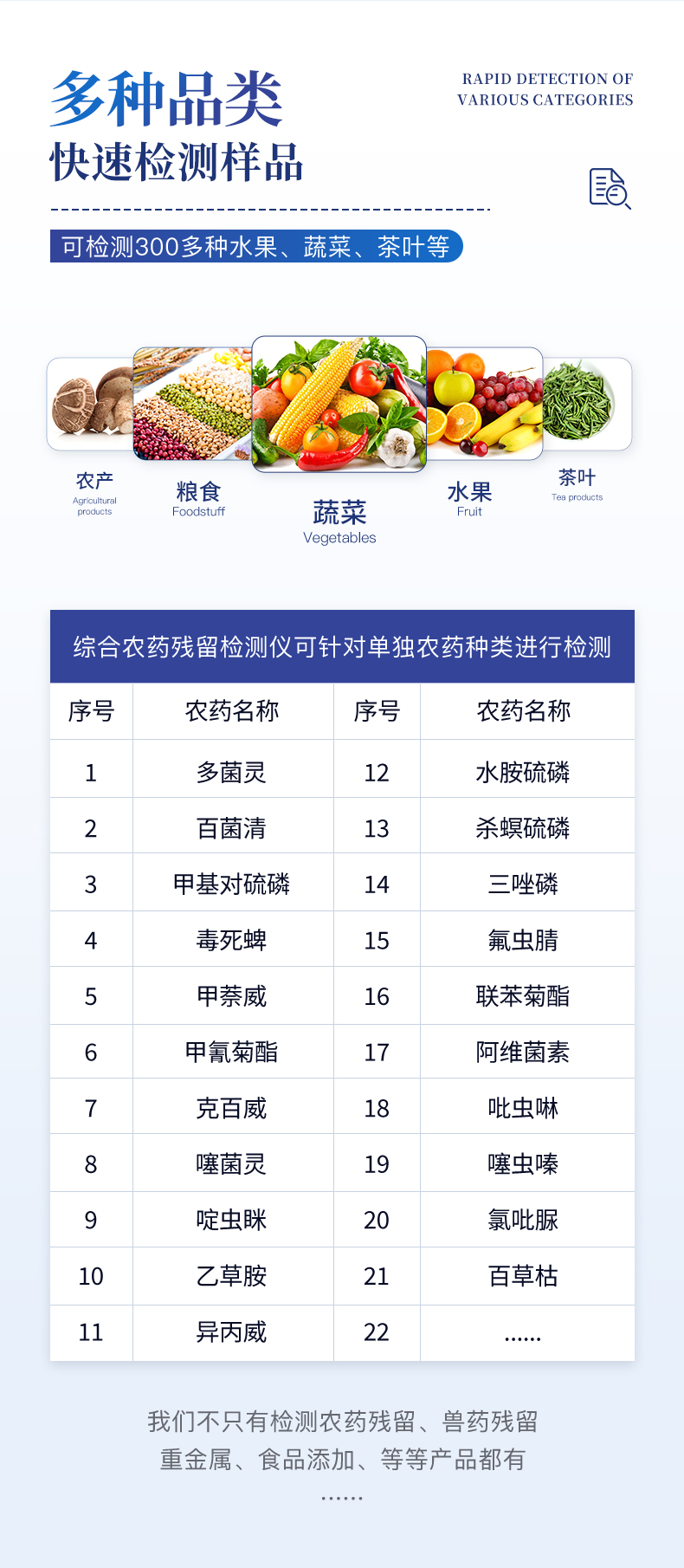 綜合農(nóng)藥殘留檢測(cè)儀,除了遵循國(guó)標(biāo)對(duì)有機(jī)磷和氨基甲酸酯類農(nóng)藥進(jìn)行檢測(cè)外,還可以針對(duì)具體農(nóng)藥進(jìn)行分項(xiàng)準(zhǔn)確檢測(cè),包含吡蟲啉、噻蟲嗪、多菌靈、百菌清、克百威、毒死蜱、異丙威、啶蟲脒、氟蟲腈、水胺硫磷、甲萘威、三唑磷、百草枯、甲霜靈、殺螟硫磷、百菌清-多菌靈2合1、氟蟲腈-甲萘威2合1、甲基對(duì)硫磷、乙草胺、阿維菌素、有機(jī)磷、甲草胺、涕滅威、噻菌靈、三唑酮、氯吡脲、多效唑、氯噻啉、霜霉威、噻蟲啉、辛硫磷、苯醚甲環(huán)唑、4-氯苯氧乙酸、2,4-二氯苯氧乙酸、2,4,5-三氯苯氧乙酸、6-芐基腺嘌呤、除草定、烯啶蟲胺、異菌脲、氟苯脲、腐霉利、甲氰菊酯、**氯氟氰菊酯、二甲戊靈、氟節(jié)甲基異柳磷、噠螨靈、噻蟲胺、烯酰嗎啉、嘧菌酯、氟樂(lè)靈、嘧霉胺、三唑酮/三唑醇、滅蠅胺、戊唑醇、甲拌磷、氯蟲苯甲酰胺、二嗪磷、氧樂(lè)果、甲基吡啶磷、阿滅丁、雙甲脒等眾多殺蟲劑化合物。