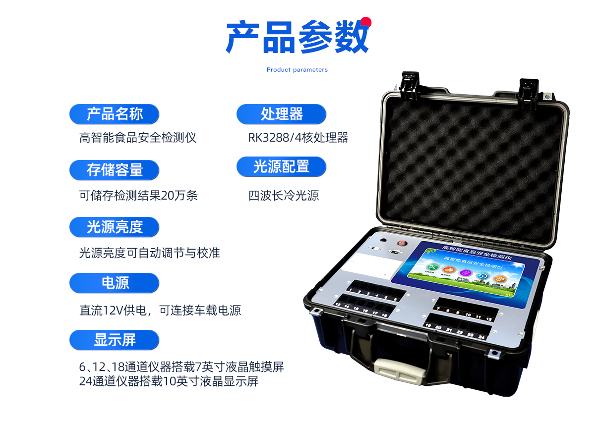 | 主控芯片采用ARM Cortex-A7,RK3288/4核處理器,主頻1.88Ghz,運(yùn)轉(zhuǎn)速度更快速,穩(wěn)定性更強(qiáng)。 | 顯示方式:7英寸液晶觸摸屏顯示,人性化中文操作界面,讀數(shù)直觀、簡(jiǎn)單。 | 交直流兩用,直流12V供電,可連接車載電源,可配6ah大容量充電鋰電池,方便戶外流動(dòng)測(cè)試。 | 四波長(zhǎng)冷光源,24個(gè)檢測(cè)通道,每個(gè)通道均配置410、520、590、630nm波長(zhǎng)光源,標(biāo)配**的光路切換裝置,專業(yè)光路切換功能可實(shí)現(xiàn)*多64波長(zhǎng),并且所有檢測(cè)項(xiàng)目可實(shí)現(xiàn)所有通道同時(shí)檢測(cè)。 | 智能恒流穩(wěn)壓,光強(qiáng)自動(dòng)調(diào)節(jié)與校準(zhǔn),長(zhǎng)時(shí)間連續(xù)工作光源無(wú)溫漂現(xiàn)象。 | 內(nèi)置新國(guó)家限量標(biāo)準(zhǔn),與所測(cè)結(jié)果進(jìn)行現(xiàn)場(chǎng)比對(duì),并持續(xù)更新標(biāo)準(zhǔn)。 | 不間斷進(jìn)樣,連續(xù)檢測(cè) | 樣本編號(hào)自動(dòng)累加。 | 數(shù)據(jù)無(wú)線上傳平臺(tái),并可從平臺(tái)導(dǎo)出為Excel表格。 | 檢測(cè)結(jié)果存儲(chǔ)容量20萬(wàn)條 | 同時(shí)支持U盤拷貝,標(biāo)準(zhǔn)USB接口,免驅(qū)動(dòng)插拔。 | 檢測(cè)項(xiàng)目可擴(kuò)充,固件可升級(jí) | 儀器尺寸:43×35×19cm, 主機(jī)凈重:5.1kg |
