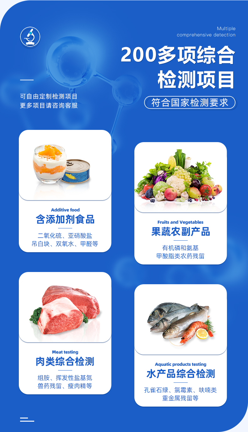| 食品添加劑:二氧化硫、雙氧水、亞硝酸鹽、硝酸鹽、苯甲酸鈉、山梨酸、糖精鈉、甜蜜素、安賽蜜、硫酸鎂等 | 有毒有害物質(zhì):甲醛、吊白塊、硼砂、過氧化苯甲酰、溴酸鉀、羅丹明B、三聚氰胺、蘇丹紅等 | 果蔬中:有機磷和氨基甲酸酯類農(nóng)藥殘留; | 病害肉診斷:組胺、揮發(fā)性鹽基氮、肉制品酸價、水發(fā)產(chǎn)品中組胺 | 重金屬含量:鉛、鎘、鉻、汞、砷、錫、鎳、鋁等;食用油脂檢測:過氧化值、酸價、油脂丙二醛等。 | 瘦肉精激素類(獸藥):鹽酸克倫特羅、沙丁胺醇、萊克多巴胺、己烯雌酚、喹乙醇等 | 抗生素殘留類(獸藥):四環(huán)素類、硝基呋喃類、磺胺類、沙星類、喹諾酮類、慶大霉素、鏈霉素、阿莫西林、紅霉素等 | 水產(chǎn)品安全類:孔雀石綠、氯霉素、呋喃妥因代謝、呋喃西林代謝、呋喃它酮代謝、呋喃唑酮代謝等 | 真菌毒素類:食用油、糧食及飼料中黃曲霉毒素B1、奶中黃曲霉毒素M1、嘔吐毒素、玉米赤霉烯酮、赭曲霉毒素A等 | 水酒飲品分析:乳品及牛奶中蛋白質(zhì);酒中甲醇、乙醇、雜醇油;蜂蜜中果糖和葡萄糖、蔗糖、淀粉酶、酸度;水中氰化物、余氯,飲料中維C等 | 調(diào)味品成分:食醋的總酸、醬油的總酸、芝麻油純度、谷氨酸鈉、醬油氨基酸態(tài)氮、食鹽中亞鐵氰化鉀、食鹽中碘等 | 食用色素類:紅色色素(胭脂紅、莧菜紅、赤蘚紅、誘惑紅)、黃色色素(檸檬黃、日落黃)、藍色色素(亮藍)等 | 動物疫病類:豬藍耳病毒、豬瘟病毒、豬偽狂犬病毒、豬偽狂犬病毒gE蛋白、豬口蹄疫3ABC蛋白、豬口蹄疫病毒IgG、豬細小病毒、雞禽流感等 |