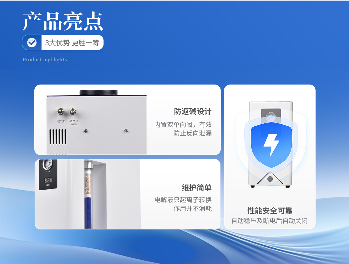 1、可取代高壓氮?dú)馄浚箤?shí)驗(yàn)室儀器化。    2、操作簡(jiǎn)便,只需啟動(dòng)電源開關(guān),儀器即可產(chǎn)氮且輸出壓力穩(wěn)定。    3、不消耗電解液;電解液只起離子轉(zhuǎn)換作用并不消耗,所以只需補(bǔ)充因蒸發(fā)而損失的少量蒸餾水。    4、產(chǎn)氣純度高,空氣經(jīng)電解池分離后即可得到高純氮?dú)狻?   5、性能安全可靠:具有穩(wěn)壓和斷電后自動(dòng)關(guān)閉氣路功能。    6、壽命長(zhǎng),既可間斷使用,又可連續(xù)使用且產(chǎn)氣量穩(wěn)定、不衰減。    7、**節(jié)能:采用**的開關(guān)電源,提高了電解效率。    8、配有雙單向閥,自動(dòng)防返堿。
