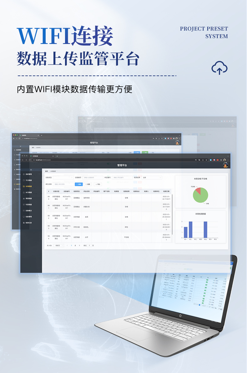 4、儀器帶有監(jiān)管平臺(tái),數(shù)據(jù)可局域網(wǎng)和互聯(lián)網(wǎng)數(shù)據(jù)上傳,檢測(cè)結(jié)果直接傳至食品安全監(jiān)管平臺(tái)。進(jìn)行區(qū)域食品安全監(jiān)管及大數(shù)據(jù)分析處理與數(shù)據(jù)統(tǒng)計(jì),檢測(cè)區(qū)域食品安全長(zhǎng)短期動(dòng)態(tài),達(dá)到食品安全問題預(yù)估、預(yù)警