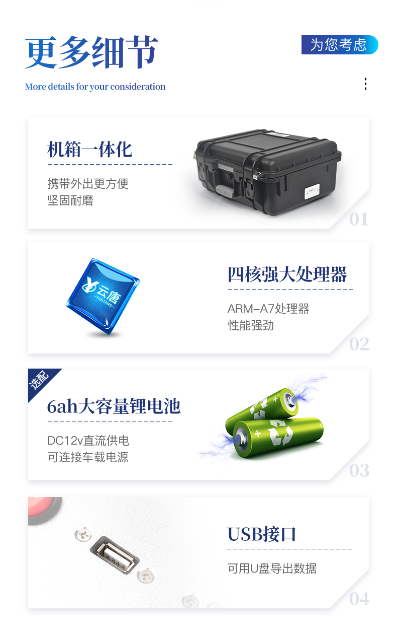 3、交直流兩用,直流12V供電,可連接車載電源,可配6ah大容量充電鋰電池,方便戶外流動(dòng)測(cè)試。