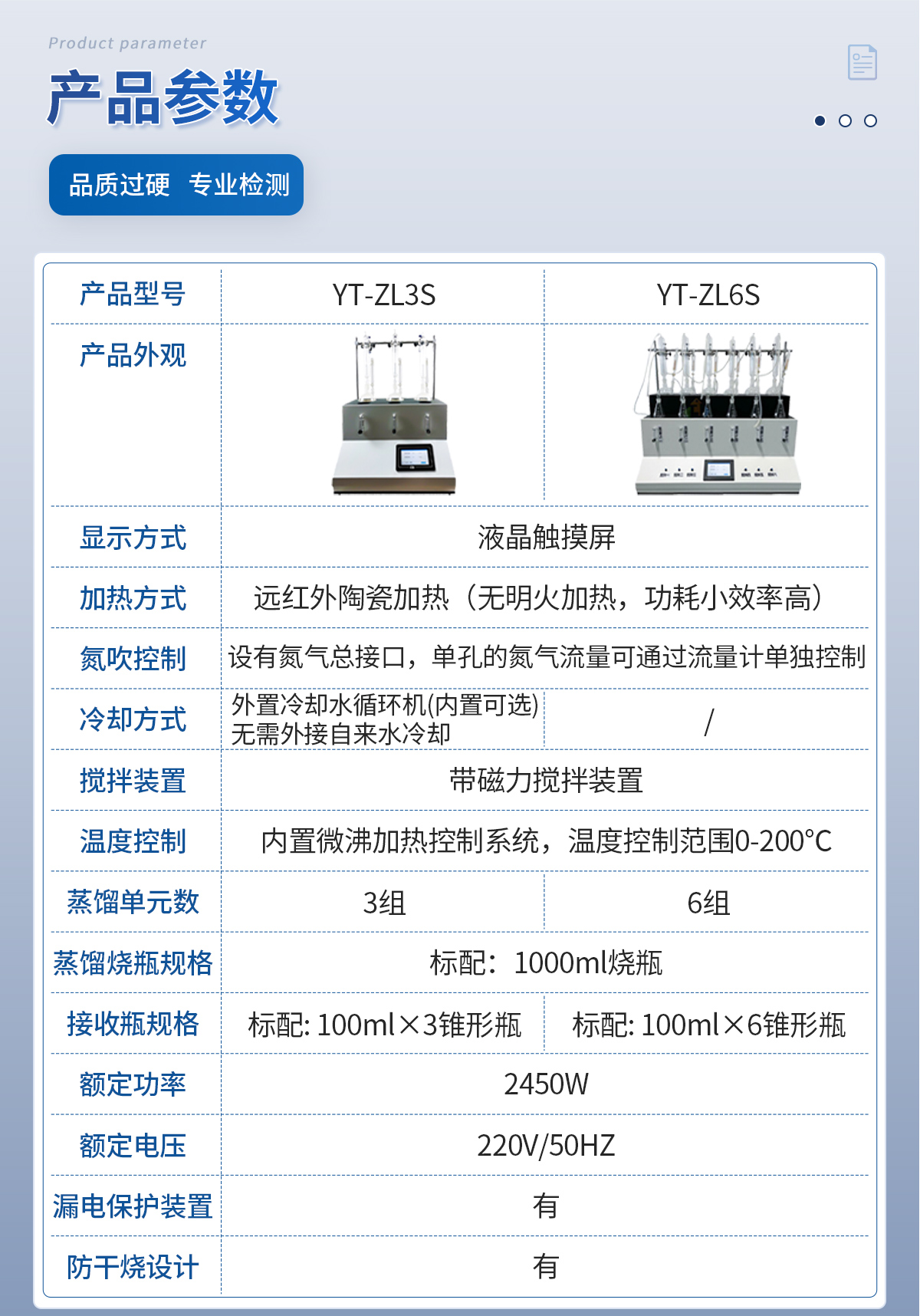 主要原理是根據(jù)藥典中所提供的檢測方法,將中藥材以蒸餾法進行處理,樣品中的亞硫酸鹽系列物質(zhì)加酸處理后轉(zhuǎn)化為二氧化硫后,隨氮氣流帶入到含有雙氧水的吸收瓶中,雙氧水將其氧化為硫酸根離子,采用酸堿滴定法測定,計算藥材及飲片中的二氧化硫殘留量。本產(chǎn)品在嚴格遵循藥典要求的基礎(chǔ)上,整合加熱,蒸餾,水循環(huán)及氮吹等功能為一體,可同時提供3-5個樣品(空白樣,平行樣)的處理,從而極大的提高了檢測數(shù)據(jù)的精度和減少了工作時間。