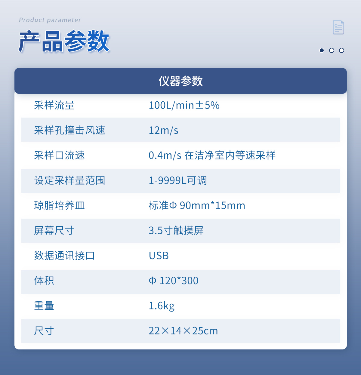 采樣流量:100L/min±5% 采樣孔撞擊風速:12m/s 采樣口流速:0.4m/s 在潔凈室內等速采樣 設定采樣量范圍:1-9999L可調 瓊脂培養(yǎng)皿:標準? 90mm*15mm 屏幕尺寸:3.5寸觸摸屏 數(shù)據(jù)通訊接口:USB 體積:Φ 120*300 重量:1.6kg 尺寸:22×14×25cm
