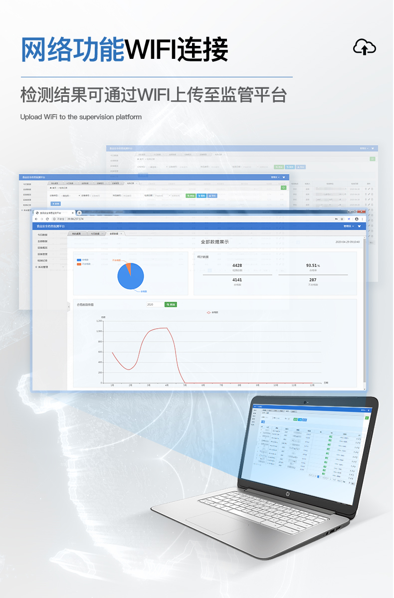 8、儀器帶有監(jiān)管平臺。數(shù)據(jù)可局域網(wǎng)和互聯(lián)網(wǎng)數(shù)據(jù)上傳,檢測結(jié)果直接傳至食品安全監(jiān)管平臺。進行區(qū)域食品安全監(jiān)管及大數(shù)據(jù)分析處理,檢測區(qū)域食品安全長短期動態(tài),達到食品安全問題預(yù)估、預(yù)警