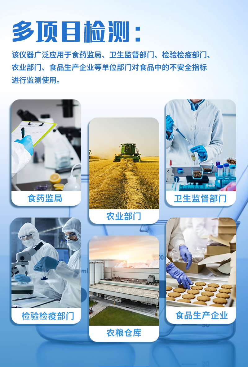 金標(biāo)度數(shù)儀快速定量檢測獸藥殘留、抗生素類殘留、激素類殘留、毒素類殘留,化學(xué)類殘留等幾十種項目并可根據(jù)用戶需要擴充新的檢測項目如農(nóng)藥殘留、食品添加劑、色素、可現(xiàn)場快速檢測農(nóng)藥殘留、鹽酸克倫特羅、沙丁胺醇、萊克多巴胺、四環(huán)素類、硝基呋喃類、磺胺類、沙星類、氯霉素、孔雀石綠磺胺類、豬藍(lán)耳病毒、豬瘟病毒、黃曲霉毒素B1、豬偽狂犬病毒、豬偽狂犬病毒gE蛋白、豬口蹄疫3ABC蛋白、豬口蹄疫病毒IgG、豬細(xì)小病毒、雞禽流感等定性和定量快速檢測等、并且可以連接食品安全監(jiān)控系統(tǒng)。