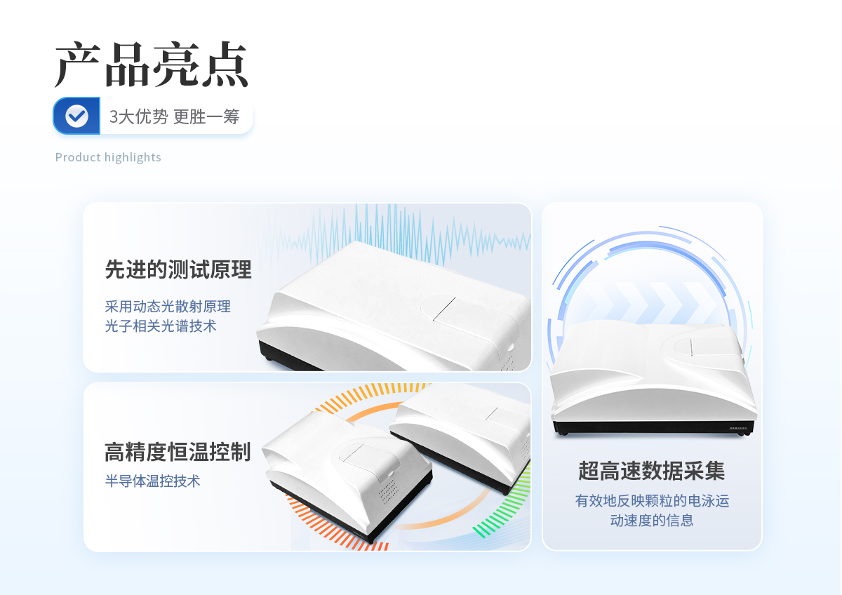 雙波長(zhǎng)激光器,全自動(dòng)切換 獨(dú)家采用雙波長(zhǎng)(λ= 405nm、λ= 532nm)激光器搭建而成的光路系統(tǒng),相關(guān)譜探測(cè)系統(tǒng)不僅體積小,而且具有很強(qiáng)的抗干擾能力,從而保證了測(cè)試的穩(wěn)定性;對(duì)某些具有吸光屬性,傳統(tǒng)單一波長(zhǎng)激光器無(wú)法檢測(cè)的樣品,可進(jìn)行有效檢測(cè);**的測(cè)試原理 采用動(dòng)態(tài)光散射原理和光子相關(guān)光譜技術(shù),根據(jù)顆粒在液體中的布朗運(yùn)動(dòng)速度測(cè)定顆粒大小。大小顆粒運(yùn)動(dòng)速度不同,激光照射這些顆粒,不同大小的顆粒將使散射光發(fā)生快慢不同的漲落起伏。光子相關(guān)光譜法就根據(jù)特定方向的光子漲落起伏分析其顆粒大小。超高速數(shù)據(jù)采集 使用PCS技術(shù)測(cè)定納米級(jí)顆粒大小,必須能夠分辨納秒級(jí)信號(hào)起伏。本儀器的核心部件采用我公司研制的CR256數(shù)字相關(guān)器,具有識(shí)別8ns的**分辨能力和**的信號(hào)處理速度,其數(shù)據(jù)處理速度高達(dá)162M。它能實(shí)時(shí)完成動(dòng)態(tài)散射光強(qiáng)的采集和自相關(guān)函數(shù)運(yùn)算,從而有效地反映不同大小顆粒的動(dòng)態(tài)分光散射信息,為測(cè)試結(jié)果的準(zhǔn)確性典型基礎(chǔ)。高靈敏度和信噪比 采用專(zhuān)業(yè)級(jí)高性能光電倍增管,對(duì)光子信號(hào)具有**的靈敏度和信噪比。高精度雙溫控保護(hù)系統(tǒng) 采用半導(dǎo)體溫控技術(shù),樣品池溫控系統(tǒng)和激光器溫控系統(tǒng)精度高達(dá)±0.1℃,使被測(cè)樣品和激光器光源在整個(gè)測(cè)試過(guò)程中都處于恒溫狀態(tài),避免溫度變化對(duì)不測(cè)試結(jié)果的影響,確保測(cè)試準(zhǔn)確和重復(fù);穩(wěn)定的光路系統(tǒng) 采用光纖技術(shù)搭建而成的光路系統(tǒng),使光子相關(guān)譜探測(cè)系統(tǒng)不僅體積小,而且具有很強(qiáng)的抗干擾能力,從而保證了測(cè)試的穩(wěn)定性。
