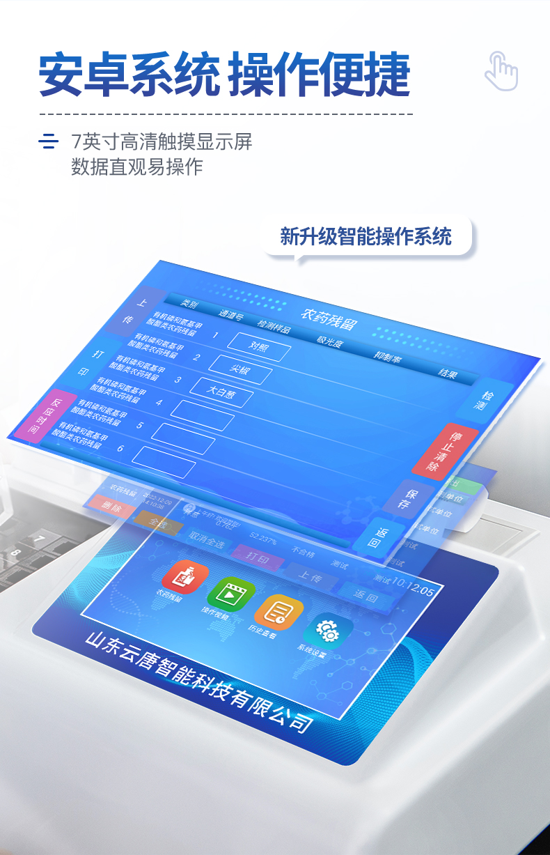 乙酰膽堿酯酶和丁酰膽堿酯酶試劑均可以使用,符合國家標(biāo)準(zhǔn)和農(nóng)業(yè)部標(biāo)準(zhǔn)的要求。 自動判斷樣品是否合格,檢測結(jié)果更加直觀。儀器具有100多種蔬菜名稱菜單庫,分類管理,并可按需添加或刪除蔬菜名,編輯蔬菜名稱,可直接打印出蔬菜名稱。 檢測通道:16個檢測通道,可以同時測試多個樣品,循環(huán)檢測,即放即檢,每個樣品由程序控制分別獨立工作,不會互相干擾。智能操作系統(tǒng),采用更加人性化操作,主控采用多核處理器,主頻1.88Ghz,運轉(zhuǎn)速度更快速,穩(wěn)定性更強。 顯示方式:7英寸高靈敏真彩觸摸屏顯示,人性化中文操作界面,讀數(shù)直觀、簡單。打印機采用串口5v打印,可選擇手動打印或者自動打印,三分鐘出打印結(jié)果,打印格式為檢測人姓名、吸光度差值、檢測時間、檢測機構(gòu)、樣品名稱及結(jié)果判定。 光源采用進口超高亮發(fā)光二極管,具有低功耗、高精度、穩(wěn)定性強、光源可控可以關(guān)掉不使用的光源,響應(yīng)速度快等優(yōu)點。智能恒流穩(wěn)壓,光強自動校準(zhǔn),長時間連續(xù)工作光源無溫漂現(xiàn)象。 儀器具有GPRS遠傳功能,可插手機卡實現(xiàn)數(shù)據(jù)遠傳平臺,wifi聯(lián)網(wǎng)功能,可將數(shù)據(jù)快速上傳電腦,進行數(shù)據(jù)管理與統(tǒng)計。采用USB2.0接口設(shè)計,方便數(shù)據(jù)的存貯和移動,并可隨時與計算機直接相連,并且可用計算機控制儀器。實現(xiàn)數(shù)據(jù)查詢、瀏覽、分析、統(tǒng)計、打印等。 智能化程度高,儀器具有自檢功能:具有開機自檢和調(diào)零功能,具有自動檢測重復(fù)性功能儀器具有自身保護功能,可設(shè)置用戶名及密碼,防止非工作人員操作等。 采用DC12v直流供電,安全系統(tǒng)更高,并且配備6A鋰電池充電器。儀器具有重新校準(zhǔn)、鎖定、恢復(fù)出廠設(shè)置功能。