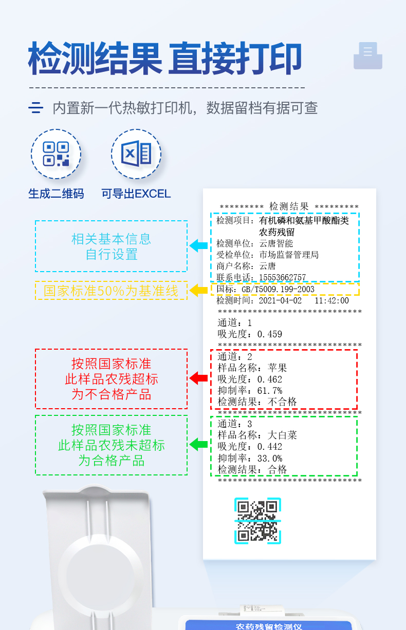 | 乙酰膽堿酯酶和丁酰膽堿酯酶試劑均可以使用,符合國(guó)家標(biāo)準(zhǔn)和農(nóng)業(yè)部標(biāo)準(zhǔn)的要求。 | 自動(dòng)判斷樣品是否合格,檢測(cè)結(jié)果更加直觀(guān)。 | 儀器具有100多種蔬菜名稱(chēng)菜單庫(kù),分類(lèi)管理,并可按需添加或刪除蔬菜名,編輯蔬菜名稱(chēng),可直接打印出蔬菜名稱(chēng)。 | 檢測(cè)通道:20個(gè)檢測(cè)通道,可以同時(shí)測(cè)試多個(gè)樣品,循環(huán)檢測(cè),即放即檢,每個(gè)樣品由程序控制分別獨(dú)立工作,不會(huì)互相干擾。 | 智能操作系統(tǒng),采用更加人性化操作,主控采用多核處理器,主頻1.88Ghz,運(yùn)轉(zhuǎn)速度更快速,穩(wěn)定性更強(qiáng)。 | 顯示方式:7英寸高靈敏真彩觸摸屏顯示,人性化中文操作界面,讀數(shù)直觀(guān)、簡(jiǎn)單。 | 打印機(jī)采用串口5v打印,可選擇手動(dòng)打印或者自動(dòng)打印,三分鐘出打印結(jié)果,打印格式為檢測(cè)人姓名、吸光度差值、檢測(cè)時(shí)間、檢測(cè)機(jī)構(gòu)、樣品名稱(chēng)及結(jié)果判定。 | 光源采用進(jìn)口超高亮發(fā)光二極管,具有低功耗、高精度、穩(wěn)定性強(qiáng)、光源可控可以關(guān)掉不使用的光源,響應(yīng)速度快等優(yōu)點(diǎn)。 | 智能恒流穩(wěn)壓,光強(qiáng)自動(dòng)校準(zhǔn),長(zhǎng)時(shí)間連續(xù)工作光源無(wú)溫漂現(xiàn)象。 | 儀器具有GPRS遠(yuǎn)傳功能,可插手機(jī)卡實(shí)現(xiàn)數(shù)據(jù)遠(yuǎn)傳平臺(tái),wifi聯(lián)網(wǎng)功能,可將數(shù)據(jù)快速上傳電腦,進(jìn)行數(shù)據(jù)管理與統(tǒng)計(jì)。 | 采用USB2.0接口設(shè)計(jì),方便數(shù)據(jù)的存貯和移動(dòng),并可隨時(shí)與計(jì)算機(jī)直接相連,并且可用計(jì)算機(jī)控制儀器。實(shí)現(xiàn)數(shù)據(jù)查詢(xún)、瀏覽、分析、統(tǒng)計(jì)、打印等。 | 智能化程度高,儀器具有自檢功能:具有開(kāi)機(jī)自檢和調(diào)零功能,具有自動(dòng)檢測(cè)重復(fù)性功能 | 儀器具有自身保護(hù)功能,可設(shè)置用戶(hù)名及密碼,防止非工作人員操作等。 | 采用DC12v直流供電,安全系統(tǒng)更高,并且配備6A鋰電池充電器。 | 儀器具有重新校準(zhǔn)、鎖定、恢復(fù)出廠(chǎng)設(shè)置功能。 |