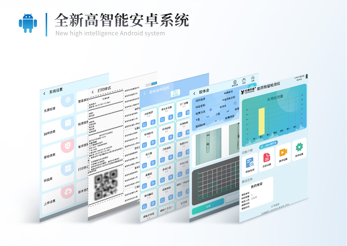 | 儀器采用10.1英寸液晶觸摸屏顯,搭配運(yùn)行安卓智能操作系統(tǒng),主控芯片采用ARM Cortex-A7,RK3288/4核處理器,主頻1.88Ghz,運(yùn)轉(zhuǎn)速度更快速,性能更強(qiáng)。 | 儀器功能包括:膠體金檢測(cè)模塊、數(shù)字化管理模塊、無線通訊模塊等,可以滿足同一軟件下實(shí)現(xiàn)所有檢測(cè)項(xiàng)目的檢測(cè),并在同一窗口展示檢測(cè)結(jié)果。 | 一體化臺(tái)式快檢設(shè)備,采用交直流兩用供電方式,可連接車載電源,配備6ah大容量充電鋰電池,可以滿足現(xiàn)場(chǎng)及流動(dòng)檢測(cè)使用的需求。儀器尺寸:43×35×20cm, 主機(jī)凈重:5.1kg | 系統(tǒng)自帶數(shù)據(jù)集成模塊,設(shè)備首頁(yè)自動(dòng)統(tǒng)計(jì)檢測(cè)數(shù)據(jù)包含:周檢測(cè)數(shù)據(jù)、月檢測(cè)數(shù)據(jù),全部檢測(cè)總數(shù)量,均包含檢測(cè)總數(shù),合格數(shù),不合格數(shù),以及相關(guān)柱形分析圖,對(duì)各項(xiàng)檢測(cè)數(shù)據(jù)清晰掌握,無需電腦查詢,更加快捷直觀。 | 儀器具有任務(wù)預(yù)設(shè)模塊,可在樣品送檢前提前預(yù)設(shè)樣品名稱、檢測(cè)指標(biāo)、送檢單位等信息,樣品送檢時(shí)一鍵調(diào)取保存信息,檢測(cè)更加方便快捷。 | 直插式自動(dòng)掃描方式,可實(shí)時(shí)顯示金標(biāo)卡實(shí)時(shí)圖像,系統(tǒng)自動(dòng)分析并呈現(xiàn)出CT曲線圖,CT線自動(dòng)識(shí)別,無需手動(dòng)調(diào)整,完成檢測(cè)后自動(dòng)退出檢測(cè)卡。 | 結(jié)果判定線可修改,對(duì)照值標(biāo)定值可保存,斷電不丟失數(shù)據(jù)。 | 兼容市場(chǎng)上其他膠體金卡,使用耗材不受限制,極大增強(qiáng)用戶使用體驗(yàn)。 | 儀器檢測(cè)系統(tǒng)擁有龐大數(shù)據(jù)庫(kù),并且構(gòu)建了完善的檢索、修訂功能。食品庫(kù)涵蓋多種樣品名稱,可按需添加或刪除、編輯樣品名稱;產(chǎn)品數(shù)據(jù)庫(kù)以及歷史檢測(cè)記錄支持一鍵檢索功能。 | 系統(tǒng)打印自定義化,打印格式多樣化,產(chǎn)品合格證(國(guó)家標(biāo)準(zhǔn)要求),二維碼,抽樣信息、檢測(cè)信息,受檢信息、復(fù)核信息、抽樣日期、檢測(cè)日期等信息結(jié)果,可按需求自行設(shè)置打印內(nèi)容。 | A4紙版本報(bào)告打印功能(可選配):設(shè)備擁有兩種結(jié)果展示方式,可以自動(dòng)生成A4打印模板和小票打印模板兩種樣式,可通過WiFi及網(wǎng)線等方式鏈接外置打印機(jī)可進(jìn)行打印 | 儀器具有 wifi 聯(lián)網(wǎng)上傳、RJ45網(wǎng)線連接功能,可以快速上傳數(shù)據(jù)。同步對(duì)接監(jiān)管平臺(tái),數(shù)據(jù)可局域網(wǎng)和互聯(lián)網(wǎng)數(shù)據(jù)上傳,檢測(cè)結(jié)果直接傳至食品安全監(jiān)管平臺(tái)。進(jìn)行區(qū)域食品安全監(jiān)管及大數(shù)據(jù)分析處理與數(shù)據(jù)統(tǒng)計(jì),檢測(cè)區(qū)域食品安全長(zhǎng)短期動(dòng)態(tài),達(dá)到食品安全問題預(yù)估、預(yù)警。 | 設(shè)備支持U盤存儲(chǔ),標(biāo)準(zhǔn)USB接口,免驅(qū)動(dòng)安裝。檢測(cè)結(jié)果存儲(chǔ)容量20萬條以上,可生成Excel表格,進(jìn)行一鍵拷貝,并具有登錄保護(hù)功能,可設(shè)置用戶名及密碼,規(guī)范不同人員操作權(quán)限,防止非工作人員操作,并且可以進(jìn)行重新校準(zhǔn)、鎖定、恢復(fù)出廠設(shè)置功能。儀器固件可升級(jí),后期檢測(cè)項(xiàng)目可擴(kuò)充。 | 儀器具備遠(yuǎn)程升級(jí)功能,可定向分客戶分儀器更新,開機(jī)后自動(dòng)更新,并可持續(xù)性免費(fèi)更新系統(tǒng)版本,無需像傳統(tǒng)產(chǎn)品返廠更新,節(jié)省時(shí)間及人力成本并避免了物流運(yùn)輸返廠升級(jí)導(dǎo)致設(shè)備損壞的潛在風(fēng)險(xiǎn)。 |