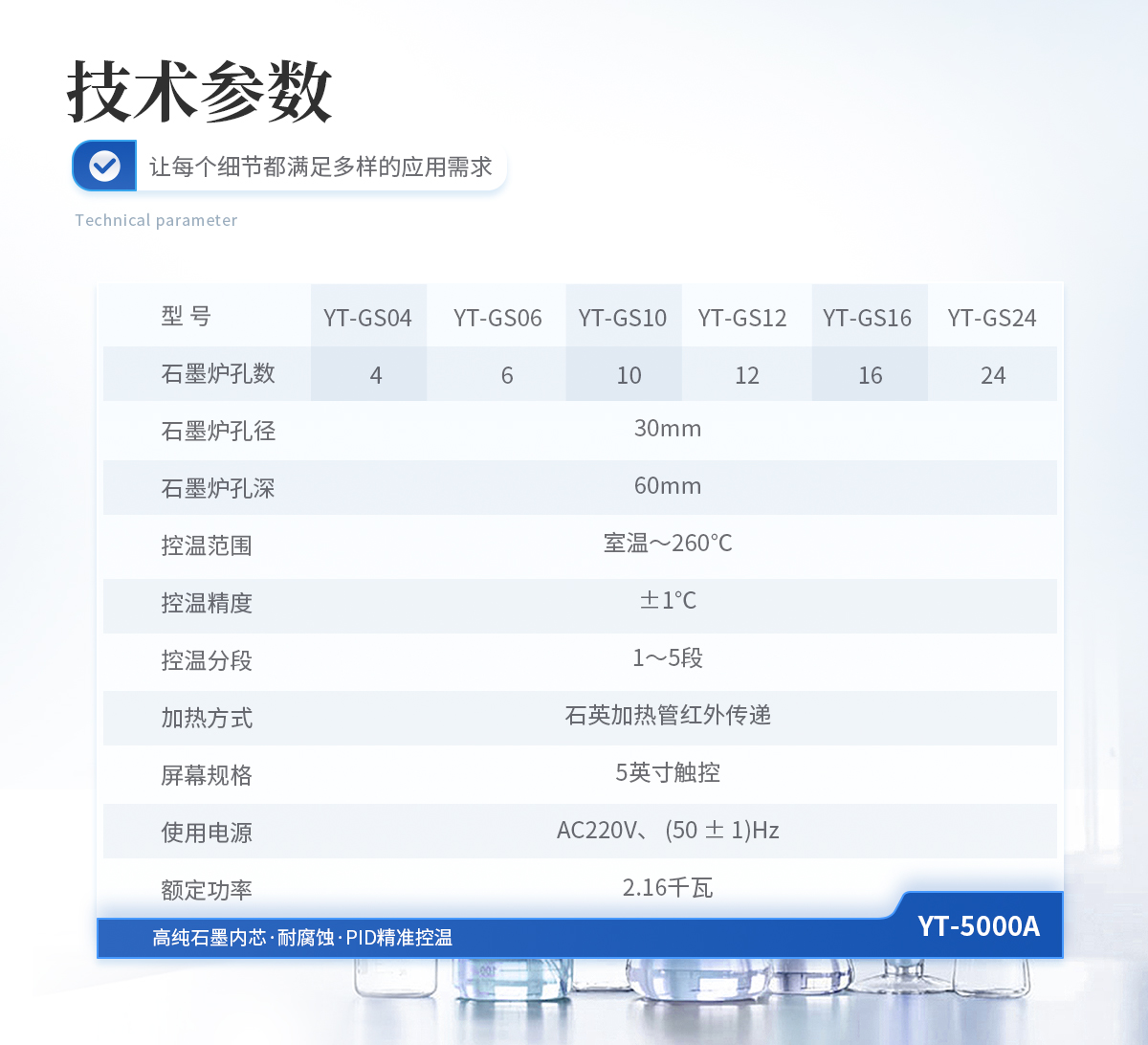 石墨爐孔:孔徑30mm,孔深60mm,孔數(shù)5×2    控溫范圍:室溫~260℃    控溫精度:±1℃    控溫分段:1~5段    加熱方式:石英加熱管紅外傳遞    屏幕規(guī)格:5寸觸控    主機(jī)外型尺寸:寬522mm×深371mm×高168mm    使用電源:AC220V、 (50 ± 1)Hz    額定功率:1.6千瓦