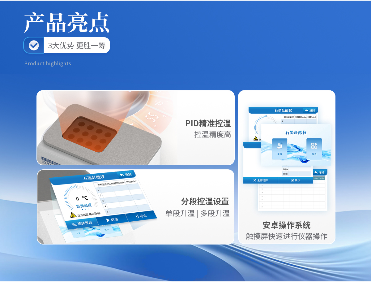 使用5寸彩色觸摸屏進行儀器操作,配備安卓操作系統(tǒng),方便快捷。    采用PID 控溫技術(shù),控溫精度高,升溫速度快, 從室溫到260℃僅需25分鐘。    分段控溫設(shè)置,即可單段升溫,也可多段升溫,設(shè)置靈活,儀器將自動按順序完成。更適于易產(chǎn)生泡沫的樣品。    采用優(yōu)質(zhì)石墨爐內(nèi)芯,平均溫差較小,樣品效果一致性好,熱傳導效率更高。石墨塊具有特氟龍涂層,耐腐蝕,延長使用壽命。