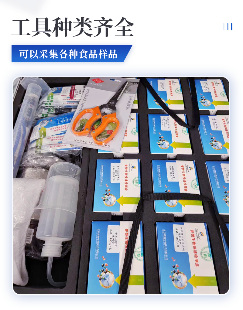 序號                                項目品       名  規(guī) 格                                檢出限                                單位                                數(shù)量                                1                                箱體                                食品安全快速檢測箱I                                便攜式                                /                                個                                1                                2                                實驗器材                                空氣吹干機                                功率:450W                                /                                個                                1                                微型離心機                                5000轉(zhuǎn)/分鐘                                /                                個                                1                                多功能攪拌機                                轉(zhuǎn)速:18000-22000轉(zhuǎn)/分鐘                                /                                臺                                1                                天平                                0.1-200g                                /                                個                                1                                移液器                                1mL                                /                                個                                1                                1ml 吸頭盒                                內(nèi)含吸頭                                /                                個                                1                                多功能剪刀                                -                                /                                個                                1                                樣品管架                                10ml                                /                                個                                1                                計時器                                -                                /                                個                                1                                塑料樣品管                                10ml                                /                                個                                20                                小離心管                                1.5ml                                /                                個                                50                                3                                水產(chǎn)品安全快速檢測卡                                氯霉素檢測卡                                10次/盒                                0.3ppb                                盒                                1                                磺胺類檢測卡                                10次/盒                                20ppb                                盒                                1                                孔雀石綠檢測卡                                10次/盒                                2ppb                                盒                                1                                呋喃西林檢測卡                                10次/盒                                0.5ppb                                盒                                1                                呋喃妥因檢測卡                                10次/盒                                0.5ppb                                盒                                1                                呋喃唑酮檢測卡                                10次/盒                                0.5ppb                                盒                                1                                呋喃它酮檢測卡                                10次/盒                                0.5ppb                                盒                                1                                4                                裝箱清單                                ——                     