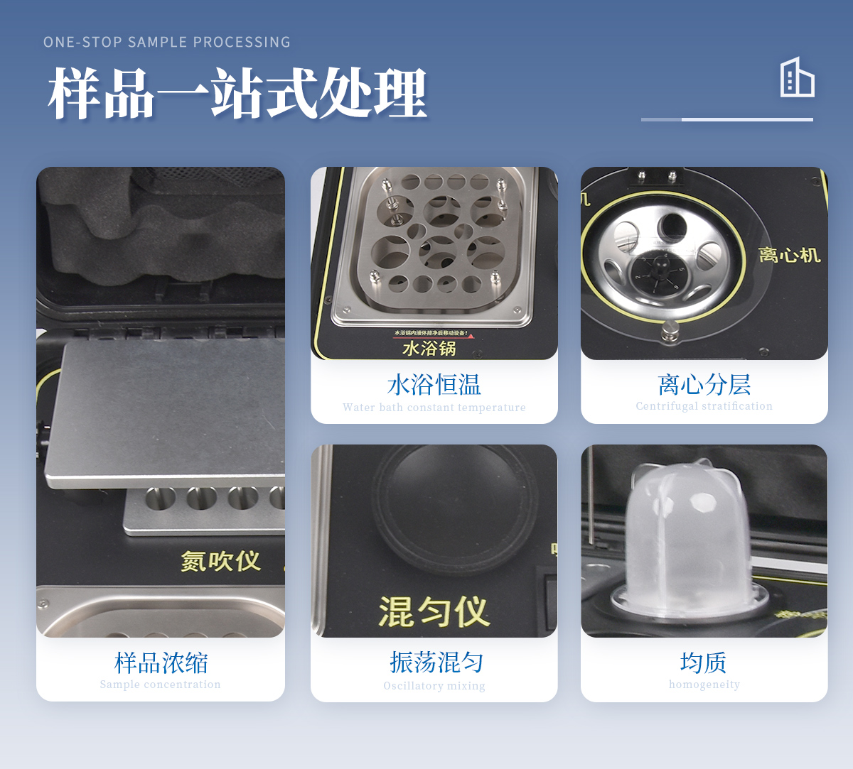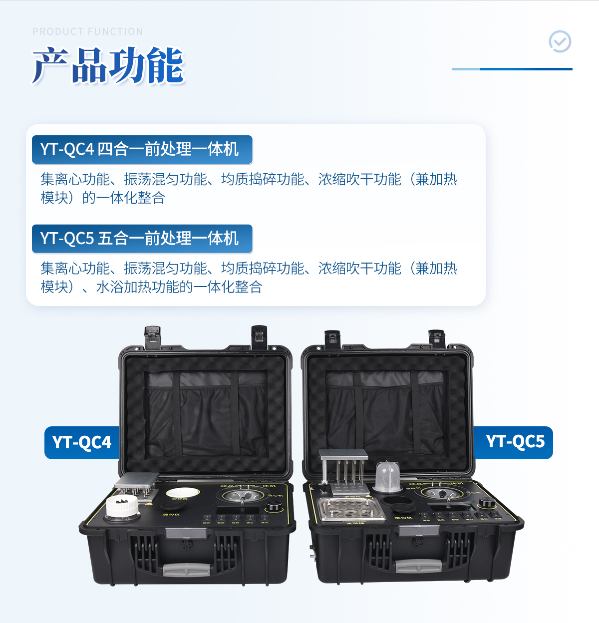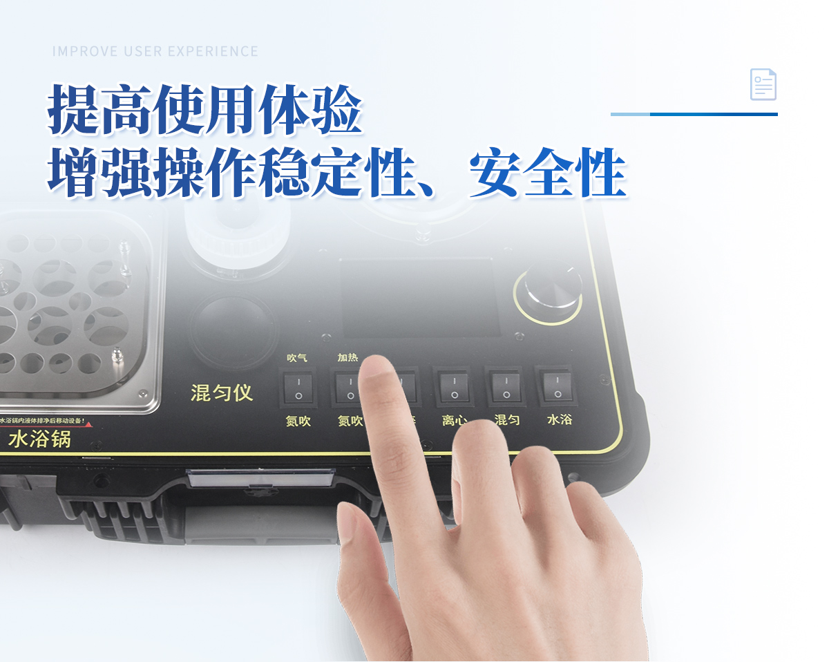 1、功能緊湊,集成四種樣品前處理常用的功能,完成樣品一站式處理。 2、結(jié)構(gòu)穩(wěn)固,機(jī)箱采用***工程塑料,具備**的抗沖擊性、耐腐蝕性、便攜性。 3、操作穩(wěn)定,機(jī)器采用五寸全彩色液晶屏,功能指示性強(qiáng),用戶操作均為實(shí)體開關(guān),杜絕佩戴手套和液體噴濺時(shí)的操作失效。