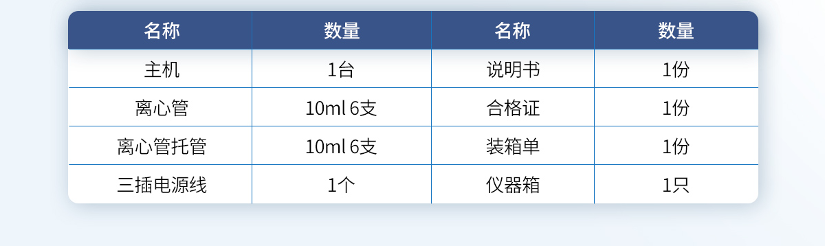 主機(jī)  1 臺(tái) 10ml離心管  6 支 10ml離心管托管  6 支 三插電源線   1 個(gè) 說明書   1 份 合格證    1 份 裝箱單  1 份 儀器箱 1只