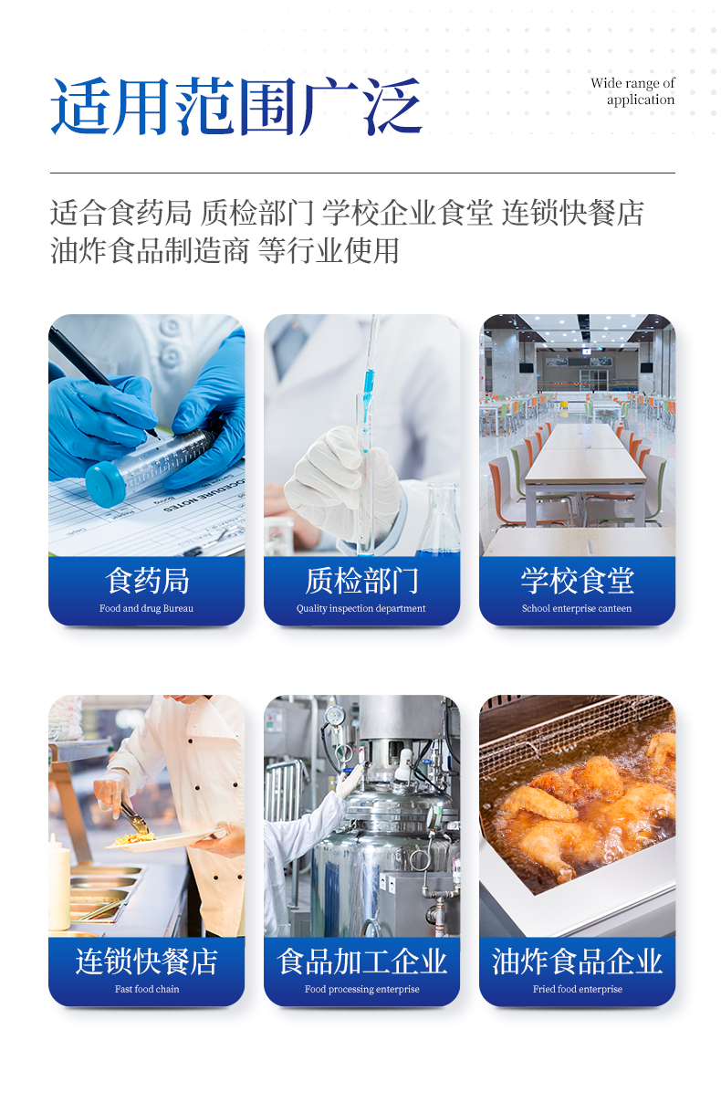 YT-SYP工業(yè)版特別適合食藥局、質檢部門、學校企業(yè)食堂、連鎖快餐店、食品加工企業(yè)、油炸食品制造商、面包房等行業(yè)使用,也可以用戶實驗室對食用油品質的初步篩選。能為您達到檢驗油品品質、節(jié)省食用油、保證產品的質量、保證食品安全的目的。