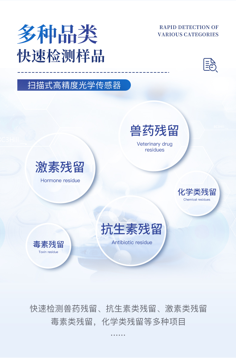 | 可快速檢測病害肉、組胺、揮發(fā)性鹽基氮,儀器預(yù)留其他項(xiàng)目檢測程序和端口,根據(jù)日后需求可方便的自主增加檢測項(xiàng)目。 |