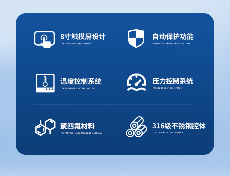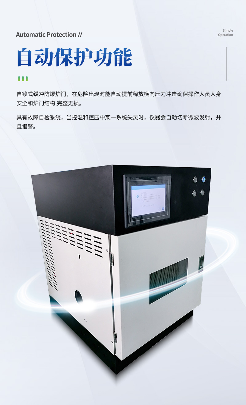 儀器采用微波非脈沖連續(xù)自動(dòng)變頻控制,延長了儀器的使用壽命和電磁波的均勻性,腔體采用52L大容積316L不銹鋼腔體材料制成,自鎖式緩沖防爆爐門,當(dāng)反應(yīng)異常時(shí),緩沖結(jié)構(gòu)確保操作人員人身安全和爐門結(jié)構(gòu)完整無損,爐門和腔體結(jié)合緊密,微波泄漏符合國家標(biāo)準(zhǔn)。儀器采用溫、壓雙控系統(tǒng)對消解實(shí)驗(yàn)的壓力和溫度進(jìn)行控制,實(shí)時(shí)顯示。360°同向連續(xù)旋轉(zhuǎn),微波均勻,確定各個(gè)樣品微波環(huán)境相同,提高實(shí)驗(yàn)結(jié)果的一致性。當(dāng)罐內(nèi)的壓力超過設(shè)定的保護(hù)值時(shí),微波會(huì)自動(dòng)停止加熱。安全防爆膜具有雙保險(xiǎn)功能,當(dāng)罐內(nèi)的壓力超過防爆膜所能承受的壓力時(shí),防爆膜先行破裂,氣體瀉出,防止罐體受損和對人體的傷害。