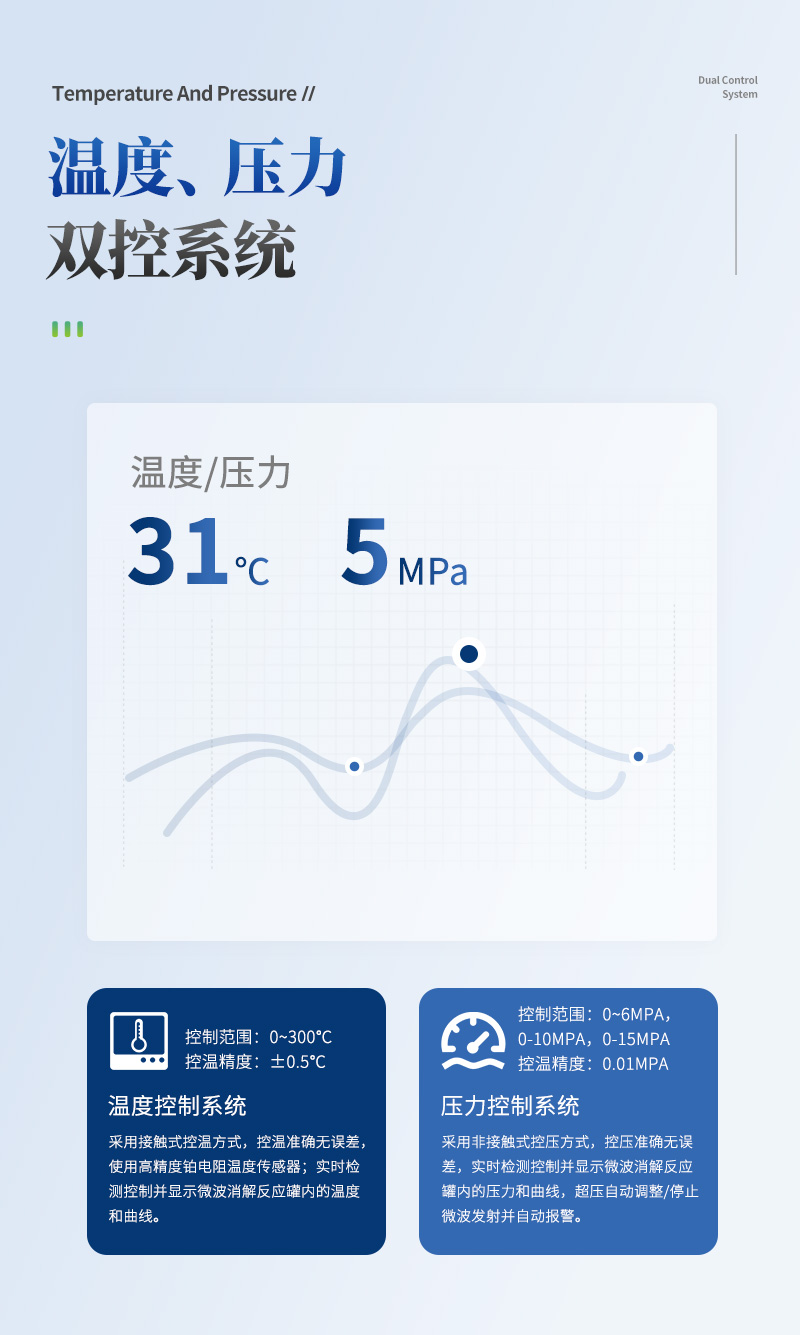 (1)溫度控制系統(tǒng):采用接觸式控溫方式,控溫準(zhǔn)確無誤差,使用高精度鉑電阻溫度傳感器;實(shí)時(shí)檢測控制并顯示微波消解反應(yīng)罐內(nèi)的溫度和曲線;(2)溫度控制范圍:0~300℃;控溫精度:±0.5℃;(3)控溫能力:速率升溫功能。(4)壓力控制系統(tǒng):采用非接觸式控壓方式,控壓準(zhǔn)確無誤差,是沿襲100年技術(shù)成熟的控壓方式。實(shí)時(shí)檢測控制并顯示微波消解反應(yīng)罐內(nèi)的壓力和曲線;(5)壓力控制范圍:范圍: 0~6MPa,0-10MPa.0-15MPa,任選。;控壓精度:0.01MPa;(6)壓力保護(hù):超壓自動(dòng)調(diào)整/停止微波發(fā)射并自動(dòng)報(bào)警;