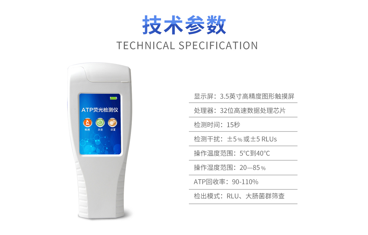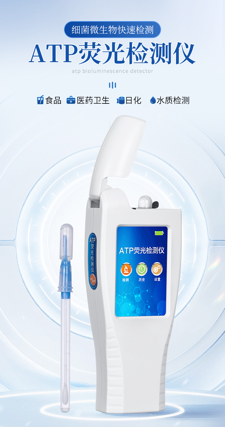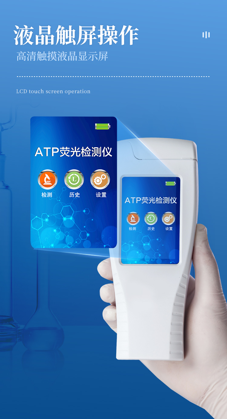 該設(shè)備為全新升級(jí)產(chǎn)品,大屏幕觸摸顯示屏,代替?zhèn)鹘y(tǒng)按鍵。操作采用生物化學(xué)反應(yīng)方法檢測(cè)ATP含量,ATP熒光檢測(cè)儀基于螢火蟲發(fā)光原理,利用“熒光素酶—熒光素體系”快速檢測(cè)三磷酸腺苷(ATP)。ATP拭子含有可以裂解細(xì)胞膜的試劑,能將細(xì)胞內(nèi)ATP釋放出來,與試劑中含有的特異性酶發(fā)生反應(yīng),產(chǎn)生光,再用熒光照度計(jì)檢測(cè)發(fā)光值,微生物的數(shù)量與發(fā)光值成正比,由于所有生物活細(xì)胞中含有恒量的ATP,所以ATP含量可以清晰地表明樣品中微生物與其他生物殘余的多少,用于判斷衛(wèi)生狀況。
