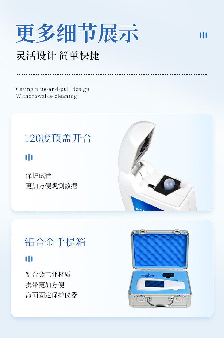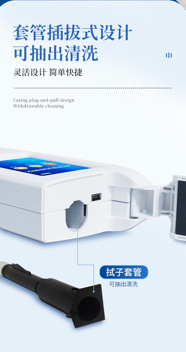 實(shí)用性 —— 可根據(jù)環(huán)境檢測(cè)需求設(shè)定上下限值,做到數(shù)據(jù)快速評(píng)估預(yù)警,表面潔凈度快速篩查。靈敏度高 —— ***************速度快 —— 常規(guī)培養(yǎng)法18-24h以上,而ATP只需要十幾秒鐘 .可行性 —— 微生物數(shù)量與微生物體內(nèi)所含ATP有明確的相關(guān)性。 通過檢測(cè)ATP含量,可間接得出反應(yīng)中微生物數(shù)量可操作性 —— 傳統(tǒng)培養(yǎng)方法需要在實(shí)驗(yàn)室由經(jīng)過培訓(xùn)的技術(shù)人員進(jìn)行操作;而ATP快速潔凈度檢測(cè)操作非常簡(jiǎn)便,只需簡(jiǎn)單的培訓(xùn)即可由一般工作人員進(jìn)行現(xiàn)場(chǎng)操作。體驗(yàn)更好 —— 試子套管采用插拔式靈活設(shè)計(jì),可定期清洗長(zhǎng)期使用,延長(zhǎng)儀器壽命。