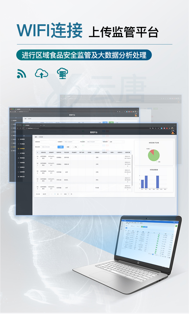 山東云唐智能科技有限公司生產(chǎn)的高智能食品安全檢測(cè)儀為集成化食品安全快速檢測(cè)分析設(shè)備,采用臺(tái)式一體化設(shè)計(jì),可快速檢測(cè)200多種食品安全項(xiàng)目,包含非食用化學(xué)物質(zhì)、濫用食品添加劑、農(nóng)藥殘留、獸藥殘留、重金屬、病害肉、營(yíng)養(yǎng)強(qiáng)化劑、抗生素類殘留、激素類殘留、真菌毒素類殘留、化學(xué)類殘留等項(xiàng)目的定性定量檢測(cè)。目前廣泛應(yīng)用于市場(chǎng)監(jiān)管局、檢測(cè)中心、衛(wèi)生監(jiān)督部門、農(nóng)業(yè)部門、院校及各單位食堂、食品肉產(chǎn)品深加工企業(yè)、商超市場(chǎng)、司法部門、餐飲機(jī)構(gòu)、養(yǎng)殖場(chǎng)、屠宰場(chǎng)、檢驗(yàn)檢疫部門等單位。