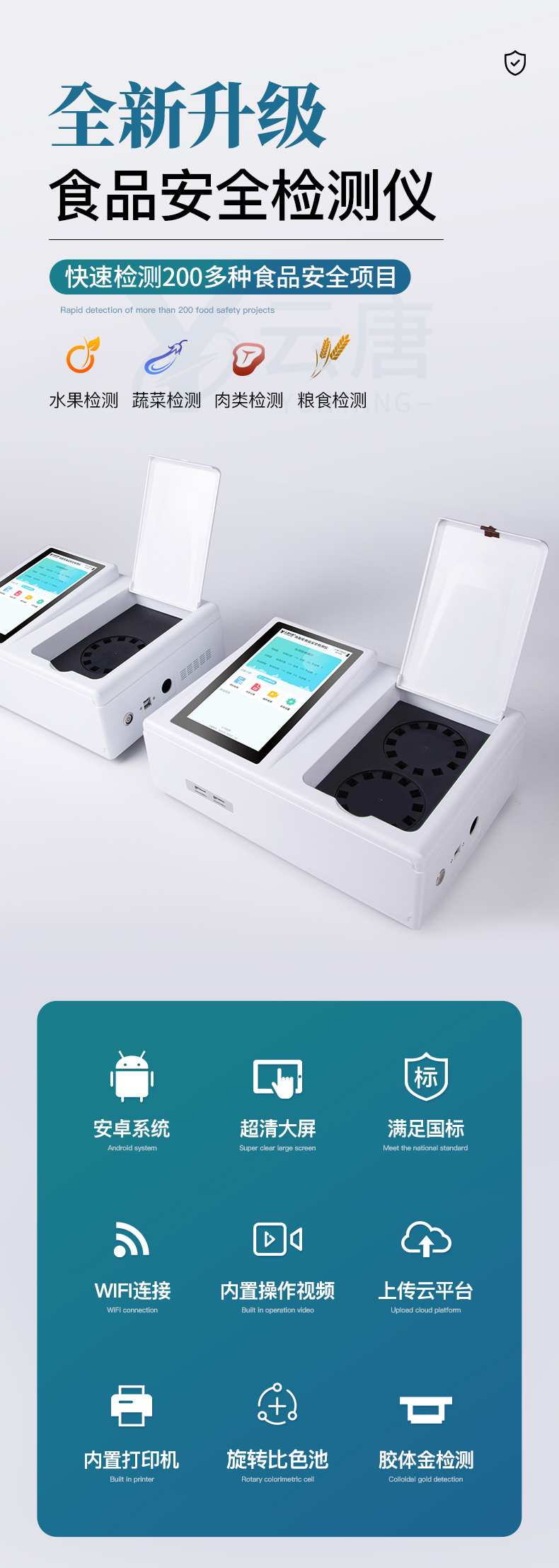 山東云唐智能科技有限公司生產(chǎn)的高智能食品安全檢測(cè)儀為集成化食品安全快速檢測(cè)分析設(shè)備,采用臺(tái)式一體化設(shè)計(jì),可快速檢測(cè)200多種食品安全項(xiàng)目,包含非食用化學(xué)物質(zhì)、濫用食品添加劑、農(nóng)藥殘留、獸藥殘留、重金屬、病害肉、營(yíng)養(yǎng)強(qiáng)化劑、抗生素類殘留、激素類殘留、真菌毒素類殘留、化學(xué)類殘留等項(xiàng)目的定性定量檢測(cè)。目前廣泛應(yīng)用于市場(chǎng)監(jiān)管局、檢測(cè)中心、衛(wèi)生監(jiān)督部門、農(nóng)業(yè)部門、院校及各單位食堂、食品肉產(chǎn)品深加工企業(yè)、商超市場(chǎng)、司法部門、餐飲機(jī)構(gòu)、養(yǎng)殖場(chǎng)、屠宰場(chǎng)、檢驗(yàn)檢疫部門等單位。