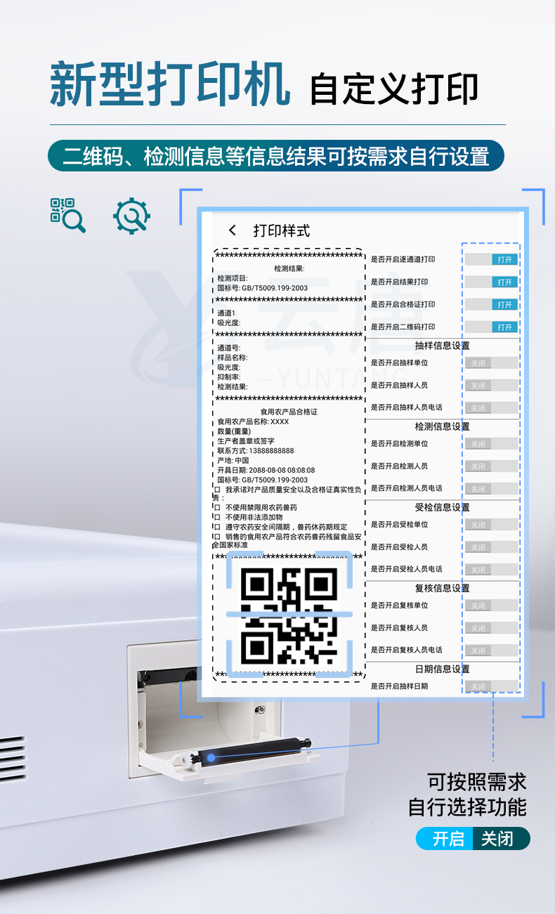 儀器采用臺式一體化系統(tǒng)檢測技術(shù),將分光光度模塊、膠體金檢測模塊、新型農(nóng)殘檢測模塊、數(shù)字化管理模塊、無線通訊模塊高度集成于一體,支持檢測200種食品安全檢測項目,同時預(yù)留升級檢測方法。儀器檢測模塊標(biāo)準(zhǔn)化、智能化,可隨意自由組合。檢測箱體內(nèi)置多個標(biāo)準(zhǔn)檢測單元,檢測模塊可以調(diào)整配置。顯示屏幕:儀器采用10.1英寸豎向液晶觸摸屏顯,搭配運行安卓智能操作系統(tǒng),主控芯片采用ARM Cortex-A7,RK3288/4核處理器,主頻1.88Ghz,操作方便,性能更強。檢測通道:≥12通道;采用精密旋轉(zhuǎn)比色池設(shè)計,使用同芯片同光源校準(zhǔn)精度,解決不同光源之間的誤差值。1-12通道間誤差0.1%。(***:**202022821055.2)儀器光源:高精度進口四波長冷光源,每個通道均配置 410、520、590、630nm 波長光源,標(biāo)配**的光路切換裝置,專利光路切換功能可實現(xiàn)64波長,并且所有檢測項目可實現(xiàn)所有通道同時檢測。設(shè)備可一鍵校準(zhǔn),自動保存校準(zhǔn)數(shù)據(jù),自動對比校驗,得到精準(zhǔn)光源,采用Android SP存儲數(shù)據(jù),光源數(shù)據(jù)永不丟失,方便每一次使用。通訊接口: 配備無線通信模塊、可選配4G(APN)通訊模塊和藍牙傳輸,同時具有雙USB接口以及RJ45網(wǎng)線接口,可以多方式實現(xiàn)數(shù)據(jù)保存及數(shù)據(jù)傳輸。存儲方式: 支持U盤存儲,標(biāo)準(zhǔn)USB接口,免驅(qū)動安裝。檢測結(jié)果存儲容量20萬條以上,可生成Excel表格進行拷貝,并具有登錄保護功能。智能化操作系統(tǒng):操作系統(tǒng):儀器可在同一檢測界面自動對應(yīng)相關(guān)檢測通道,一次性選擇1-12個樣品名稱,無需退出界面,節(jié)省操作時間。并可以對每個通道屬性和樣品信息單獨進行編輯,例如送檢單位、人員,檢測人員等,打印時勾選打印顯示。數(shù)據(jù)集成系統(tǒng):設(shè)備首頁自動匯總分析檢測數(shù)據(jù),包含:周檢測數(shù)據(jù)、月檢測數(shù)據(jù),全部檢測總數(shù)量,均包含檢測總數(shù),合格數(shù),不合格數(shù),以及相關(guān)柱形分析圖,各項檢測數(shù)據(jù)一目了然,無需電腦查詢,更加快捷直觀。數(shù)據(jù)庫系統(tǒng):十幾項數(shù)據(jù)庫分類管理儀器:包含項目類型、項目數(shù)據(jù)、檢測數(shù)據(jù)、歷史記錄、國標(biāo)信息、曲線信息、采樣信息、檢測信息、受檢信息、復(fù)核信息、圖表信息、光源校準(zhǔn)信息、打印樣式信息、樣品庫信息等等,數(shù)據(jù)庫之間互相協(xié)調(diào)聯(lián)動保證數(shù)據(jù)的真實完整性。同時產(chǎn)品數(shù)據(jù)庫以及歷史檢測記錄支持一鍵檢索功能。限量規(guī)判系統(tǒng):具有限量查詢、添加物質(zhì)合規(guī)判定系統(tǒng)。檢測出結(jié)果后,系統(tǒng)自動調(diào)用系統(tǒng)數(shù)據(jù)庫中相關(guān)國標(biāo)進行比對判定,客觀顯示判定結(jié)果是否合格。項目預(yù)設(shè)系統(tǒng):儀器具有任務(wù)預(yù)設(shè)模塊,一鍵提前預(yù)設(shè),給出方便快捷的新檢測方案,每一個任務(wù)分別可以設(shè)置不同的樣品、批次、編號、來源、備注、抽樣信息、檢測信息、受檢信息、復(fù)核信息等更多信息。樣品送檢時一鍵調(diào)取保存信息,并可多次調(diào)取,大大提高檢測效率。數(shù)據(jù)監(jiān)管系統(tǒng):同步對接監(jiān)管平臺,數(shù)據(jù)可局域網(wǎng)和互聯(lián)網(wǎng)數(shù)據(jù)上傳,檢測結(jié)果可選擇直接傳至食品安全監(jiān)管平臺。進行區(qū)域食品安全監(jiān)管及大數(shù)據(jù)分析處理與數(shù)據(jù)統(tǒng)計,檢測區(qū)域食品安全長短期動態(tài),達到食品安全問題預(yù)估、預(yù)警。全新打印系統(tǒng):內(nèi)置全新打印機,新創(chuàng)自定義打印方式,可按需靈活勾選控制:產(chǎn)品合格證(國家農(nóng)業(yè)部標(biāo)準(zhǔn)要求),二維碼,抽樣信息、檢測信息,受檢信息、復(fù)核信息、抽樣日期、檢測日期等信息的打印。A4紙版本報告打印功能(可選配):設(shè)備擁有兩種結(jié)果展示方式,可以自動生成A4打印模板和小票打印模板兩種樣式,可通過WiFi及網(wǎng)線等方式鏈接外置打印機可進行打印。供電模式:儀器交直流兩用,直流12V供電,可連接車載電源,可配6ah大容量充電鋰電池,電量可實時顯示,方便戶外流動測試。膠體金檢測模塊:采用三通道CMOS成像處理技術(shù)及膠體金免疫層析技術(shù),可同時讀取三個膠體金卡數(shù)據(jù),自動采集、處理分析,將檢測結(jié)果顯示,并可根據(jù)參考限值自動判斷檢測結(jié)果,可檢測常見的獸藥殘留、生物毒素、抗生素、違禁添加物等。探測技術(shù):CMOS成像探測;檢測通道:3通道,可同時讀取3個膠體金卡數(shù)據(jù);檢測方式:消線法和比色法;顯示模式:陰性或陽性;曲線形式:直插式掃描方式,顯示金標(biāo)卡圖像,實時生成、識別CT曲線圖,無需手動調(diào)整,完成檢測后自動退出檢測卡。兼容市場上其他金標(biāo)卡,使用耗材不受限制。儀器具備遠程升級功能,可定向分客戶分儀器更新,開機后自動更新,并可持續(xù)性免費更新系統(tǒng)版本,無需像傳統(tǒng)產(chǎn)品返廠更新,節(jié)省時間及人力成本并避免了物流運輸返廠升級導(dǎo)致設(shè)備損壞的潛在風(fēng)險。