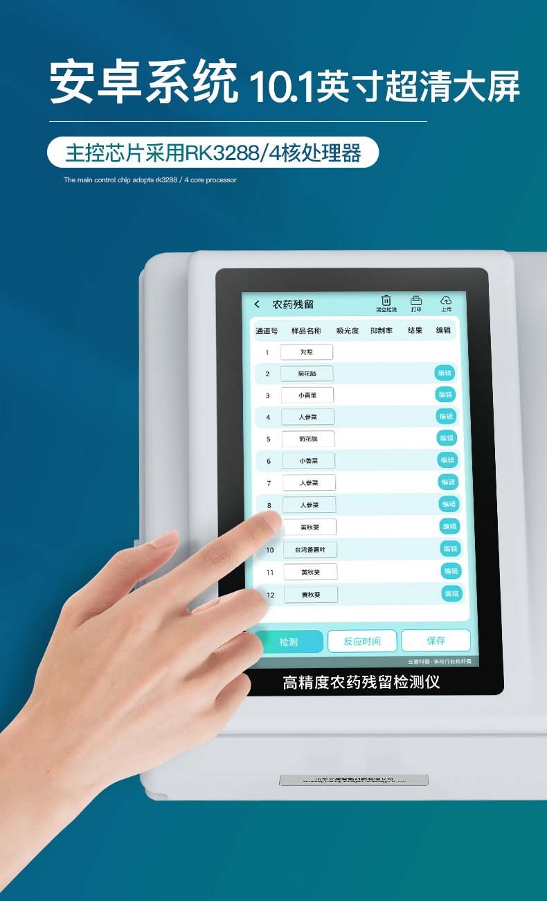 1、儀器采用臺式一體化系統(tǒng)檢測技術(shù),將分光光度模塊、膠體金檢測模塊、新型農(nóng)殘檢測模塊、數(shù)字化管理模塊、無線通訊模塊高度集成于一體,支持檢測200種食品安全檢測項目,同時預(yù)留升級檢測方法。2、儀器檢測模塊標準化、智能化,檢測項目可隨意自由組合。檢測箱體內(nèi)置多個標準檢測單元,檢測模塊可以調(diào)整配置。3、顯示屏幕:儀器采用10.1英寸豎向液晶觸摸屏顯,搭配運行安卓智能操作系統(tǒng),主控芯片采用ARM Cortex-A7,RK3288/4核處理器,主頻1.88Ghz,操作方便,性能更強。4、檢測通道:≥12通道;采用精密旋轉(zhuǎn)比色池設(shè)計,使用同芯片同光源校準精度,解決不同光源之間的誤差值,更加準確**。(1-12通道間誤差0.1%,***:**202022821055.2)5、儀器光源:高精度進口四波長冷光源,每個通道均配置 410、520、590、630nm 波長光源,標配**的光路切換裝置,專利光路切換功能可實現(xiàn)64波長,并且所有檢測項目可實現(xiàn)所有通道同時檢測。6、設(shè)備可一鍵校準,自動保存校準數(shù)據(jù),自動對比校驗,得到精準光源,采用Android SP存儲數(shù)據(jù),光源數(shù)據(jù)永不丟失,方便每一次使用。7、通訊接口:配備無線通信模塊、4G(APN)通訊模塊、藍牙傳輸,同時具有雙USB接口以及RJ45網(wǎng)線接口,可以多方式實現(xiàn)數(shù)據(jù)保存及數(shù)據(jù)傳輸。8、存儲方式:支持U盤存儲,標準USB接口,免驅(qū)動安裝。檢測結(jié)果存儲容量20萬條以上,可生成Excel表格進行拷貝,并具有登錄保護功能。9、智能化操作系統(tǒng):9.1、操作系統(tǒng):儀器可在同一檢測界面自動對應(yīng)相關(guān)檢測通道,一次性選擇1-12個樣品名稱,無需退出界面,節(jié)省操作時間。并可以對每個通道屬性和樣品信息單獨進行編輯,例如送檢單位、人員,檢測人員等,打印時勾選打印顯示。9.2、數(shù)據(jù)集成系統(tǒng):設(shè)備首頁自動匯總分析檢測數(shù)據(jù),包含:周檢測數(shù)據(jù)、月檢測數(shù)據(jù),全部檢測總數(shù)量,均包含檢測總數(shù),合格數(shù),不合格數(shù),以及相關(guān)柱形分析圖,各項檢測數(shù)據(jù)一目了然,無需電腦查詢,更加快捷直觀。9.3、數(shù)據(jù)庫系統(tǒng):十幾項數(shù)據(jù)庫分類管理儀器:包含項目類型、項目數(shù)據(jù)、檢測數(shù)據(jù)、歷史記錄、國標信息、曲線信息、采樣信息、檢測信息、受檢信息、復(fù)核信息、圖表信息、光源校準信息、打印樣式信息、樣品庫信息等等,數(shù)據(jù)庫之間互相協(xié)調(diào)聯(lián)動保證數(shù)據(jù)的真實完整性。同時產(chǎn)品數(shù)據(jù)庫以及歷史檢測記錄支持一鍵檢索功能。9.4、限量規(guī)判系統(tǒng):具有限量查詢、添加物質(zhì)合規(guī)判定系統(tǒng)。檢測出結(jié)果后,系統(tǒng)自動調(diào)用系統(tǒng)數(shù)據(jù)庫中相關(guān)國標進行比對判定,客觀顯示判定結(jié)果是否合格。9.5、項目預(yù)設(shè)系統(tǒng):儀器具有任務(wù)預(yù)設(shè)模塊,一鍵提前預(yù)設(shè),給出方便快捷的新檢測方案,每一個任務(wù)分別可以設(shè)置不同的樣品、批次、編號、來源、備注、抽樣信息、檢測信息、受檢信息、復(fù)核信息等更多信息。樣品送檢時一鍵調(diào)取保存信息,并可多次調(diào)取,大大提高檢測效率。9.6、數(shù)據(jù)監(jiān)管系統(tǒng):同步對接監(jiān)管平臺,數(shù)據(jù)可局域網(wǎng)和互聯(lián)網(wǎng)數(shù)據(jù)上傳,檢測結(jié)果可選擇直接傳至食品安全監(jiān)管平臺。進行區(qū)域食品安全監(jiān)管及大數(shù)據(jù)分析處理與數(shù)據(jù)統(tǒng)計,檢測區(qū)域食品安全長短期動態(tài),達到食品安全問題預(yù)估、預(yù)警。9.7.1、全新打印系統(tǒng):內(nèi)置全新打印機,新創(chuàng)自定義打印方式,可按需靈活勾選控制:產(chǎn)品合格證(國家農(nóng)業(yè)部標準要求),二維碼,抽樣信息、檢測信息,受檢信息、復(fù)核信息、抽樣日期、檢測日期等信息的打印。9.7.2、A4紙版本報告打印功能(選配):設(shè)備擁有兩種結(jié)果展示方式,可以自動生成A4打印模板和小票打印模板兩種樣式,可通過WiFi及網(wǎng)線等方式鏈接外置打印機可進行打印。10、供電模式:儀器交直流兩用,直流12V供電,可連接車載電源,可配6ah大容量充電鋰電池,電量可實時顯示,方便戶外流動測試。11、膠體金檢測模塊:采用單通道CMOS成像處理技術(shù)及膠體金免疫層析技術(shù),可讀取膠體金卡數(shù)據(jù),自動采集、處理分析,將檢測結(jié)果顯示,并可根據(jù)參考限值自動判斷檢測結(jié)果,可檢測常見的獸藥殘留、生物毒素、抗生素、違禁添加物等。11.1、探測技術(shù):CMOS成像探測;11.2、檢測通道:1個通道;11.3、檢測方式:消線法和比色法;11.4、顯示模式:陰性或陽性;11.5、曲線形式:直插式掃描方式,顯示金標卡圖像,實時生成、識別CT曲線圖,無需手動調(diào)整,完成檢測后自動退出檢測卡。兼容市場上其他金標卡,使用耗材不受限制。12、儀器具備遠程升級功能,可定向分客戶分儀器更新,開機后自動更新,并可持續(xù)性免費更新系統(tǒng)版本,無需像傳統(tǒng)產(chǎn)品返廠更新,節(jié)省時間及人力成本并避免了物流運輸返廠升級導(dǎo)致設(shè)備損壞的潛在風險。