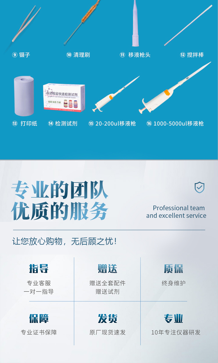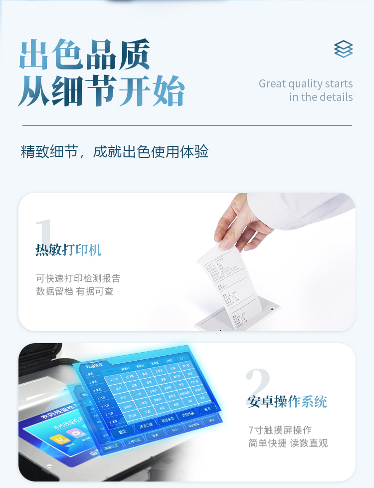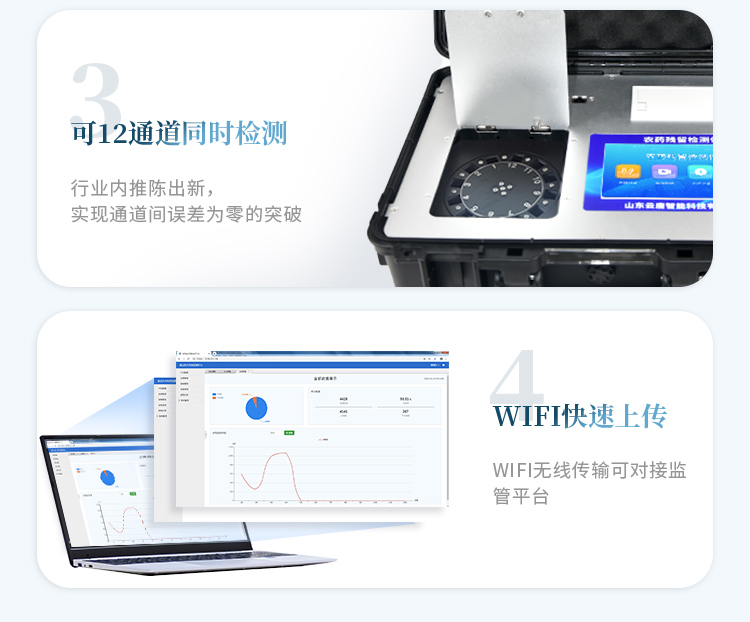 安卓智能操作系統(tǒng),采用更加**和人性化操作,儀器具有無線聯(lián)網(wǎng)上傳功能,快速上傳數(shù)據(jù),進行數(shù)據(jù)統(tǒng)計和分析。智能化程度高,儀器具有自檢功能:具有開機自檢和調(diào)零功能,具有自動檢測重復性功能;同時,檢測完成可自動打印檢測報告和二維碼。手機掃碼可顯示出詳細檢測信息。儀器帶有監(jiān)管平臺,數(shù)據(jù)可局域網(wǎng)和互聯(lián)網(wǎng)數(shù)據(jù)上傳,檢測結(jié)果直接傳至食品安全監(jiān)管平臺。進行區(qū)域食品安全監(jiān)管及大數(shù)據(jù)分析處理與數(shù)據(jù)統(tǒng)計,檢測區(qū)域食品安全長短期動態(tài),達到食品安全問題預估、預警 。樣品處理簡單省力,整體操作快速、安全、便捷。儀器具有自身保護功能,可設(shè)置用戶名及密碼,防止非工作人員操作等。內(nèi)置強大的數(shù)據(jù)庫,可在儀器上直接選擇樣品名稱、檢測指標、送檢單位等信息,也可在儀器上直接編輯錄入樣品名稱、檢測指標、送檢單位等信息并保存進樣品數(shù)據(jù)庫,方便后期操作調(diào)取使用。儀器具有重新校準、鎖定、恢復出廠設(shè)置功能。