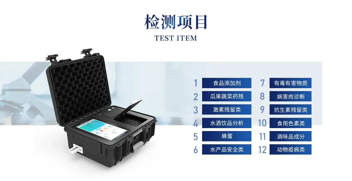 | 食品添加劑:二氧化硫、雙氧水、亞硝酸鹽、硝酸鹽、苯甲酸鈉、山梨酸鉀、糖精鈉、甜蜜素、木耳硫酸鎂等 | 有毒有害物質(zhì):甲醛、吊白塊、硼砂、過氧化苯甲酰、溴酸鉀、羅丹明B、三聚氰胺、蘇丹紅、工業(yè)堿、尿素、明礬等 | 果蔬:農(nóng)藥殘留(酶抑制率法) | 病害肉診斷:組胺、揮發(fā)性鹽基氮; | 重金屬含量:鉛、鎘、鉻、汞、砷、錫、鎳、鋁等; | 食用油脂: 過氧化值、酸價等 | 瘦肉精激素類(獸藥):鹽酸克倫特羅、沙丁胺醇、萊克多巴胺、己烯雌酚等 | 抗生素殘留類(獸藥):四環(huán)素類、硝基呋喃類、磺胺類、β-興奮劑類、沙星類、磺胺類、喹諾酮類,甲砜霉素,氟苯尼考,金剛烷胺、替米考星、慶大霉素、林可霉素、鏈霉素、恩諾沙星、環(huán)丙沙星、頭孢啦啶、青霉素、阿莫西林等 | 真菌毒素類:食用油、糧食及飼料中黃曲霉毒素B1、黃曲霉毒素總量,奶中黃曲霉毒素M1、嘔吐毒素、玉米赤霉烯酮、赭曲霉毒素A、T2毒素、伏馬毒素等; | 水酒飲品分析:酒中甲醇、乙醇、乳品及牛奶中蛋白質(zhì), | 調(diào)味品成分:食醋的總酸、醬油的總酸、芝麻油純度、谷氨酸鈉、醬油氨基酸態(tài)氮、食鹽中亞鐵氰化鉀、食鹽中碘等 | 食用色素類:紅色色素(胭脂紅、莧菜紅、赤蘚紅、誘惑紅)、黃色色素(檸檬黃、日落黃)、藍(lán)色色素(亮藍(lán))等 | 動物疫病類:禽流感、新城疫、牛羊口蹄疫、牛羊結(jié)核病、牛羊包蟲、牛羊布病、小反芻獸、豬藍(lán)耳病毒、豬瘟病毒、豬偽狂犬病毒、豬細(xì)小、豬圓環(huán)、犬細(xì)小病毒、犬瘟熱病毒、犬狂犬病毒等; | 蜂蜜成分:果糖和葡萄糖、蔗糖、淀粉酶、酸度等 | 水產(chǎn)品安全類:孔雀石綠、氯霉素、呋喃妥因、呋喃西林、呋喃它酮、呋喃唑酮等 | 蛋類藥物殘留:氯霉素,四環(huán)素,磺胺類,喹諾酮類,呋喃西林,呋喃它酮,呋喃妥因,呋喃唑酮,氟苯尼考,阿莫西林、頭孢氨芐、紅霉素、鏈霉素等 |