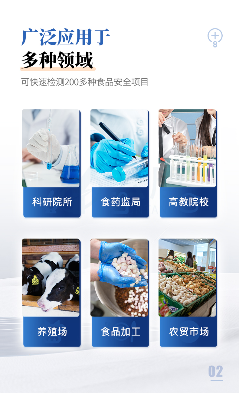 食品添加劑:二氧化硫、雙氧水、亞硝酸鹽、硝酸鹽、苯甲酸鈉、山梨酸鉀、糖精鈉、甜蜜素、木耳硫酸鎂等有毒有害物質(zhì):甲醛、吊白塊、硼砂、過氧化苯甲酰、溴酸鉀、羅丹明B、三聚氰胺、蘇丹紅、工業(yè)堿、尿素、明礬等果蔬:農(nóng)藥殘留(酶抑制率法)病害肉診斷:組胺、揮發(fā)性鹽基氮;重金屬含量:鉛、鎘、鉻、汞、砷、錫、鎳、鋁等;食用油脂: 過氧化值、酸價(jià)等瘦肉精激素類(獸藥):鹽酸克倫特羅、沙丁胺醇、萊克多巴胺、己烯雌酚等抗生素殘留類(獸藥):四環(huán)素類、硝基呋喃類、磺胺類、β-興奮劑類、沙星類、磺胺類、喹諾酮類,甲砜霉素,氟苯尼考,金剛烷胺、替米考星、慶大霉素、林可霉素、鏈霉素、恩諾沙星、環(huán)丙沙星、頭孢啦啶、青霉素、阿莫西林等真菌毒素類:食用油、糧食及飼料中黃曲霉毒素B1、黃曲霉毒素總量,奶中黃曲霉毒素M1、嘔吐毒素、玉米赤霉烯酮、赭曲霉毒素A、T2毒素、伏馬毒素等;水酒飲品分析:酒中甲醇、乙醇、乳品及牛奶中蛋白質(zhì),調(diào)味品成分:食醋的總酸、醬油的總酸、芝麻油純度、谷氨酸鈉、醬油氨基酸態(tài)氮、食鹽中亞鐵氰化鉀、食鹽中碘等食用色素類:紅色色素(胭脂紅、莧菜紅、赤蘚紅、誘惑紅)、黃色色素(檸檬黃、日落黃)、藍(lán)色色素(亮藍(lán))等動(dòng)物疫病類:禽流感、新城疫、牛羊口蹄疫、牛羊結(jié)核病、牛羊包蟲、牛羊布病、小反芻獸、豬藍(lán)耳病毒、豬瘟病毒、豬偽狂犬病毒、豬細(xì)小、豬圓環(huán)、犬細(xì)小病毒、犬瘟熱病毒、犬狂犬病毒等;蜂蜜成分:果糖和葡萄糖、蔗糖、淀粉酶、酸度等水產(chǎn)品安全類:孔雀石綠、氯霉素、呋喃妥因、呋喃西林、呋喃它酮、呋喃唑酮等蛋類藥物殘留:氯霉素,四環(huán)素,磺胺類,喹諾酮類,呋喃西林,呋喃它酮,呋喃妥因,呋喃唑酮,氟苯尼考,阿莫西林、頭孢氨芐、紅霉素、鏈霉素等