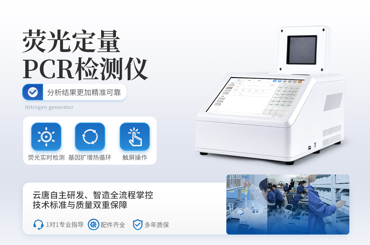 YT-P08型號 實時熒光定量PCR儀器的原理:聚合酶鏈式反應(polymerase chain reaction,PCR)是一種用于放大擴增特定的DNA片段的分子生物學技術(shù),它可看作是生物體外的特殊DNA擴增,由高溫變性、低溫退火及適溫延伸等幾步反應組成一個溫度循環(huán)周期,使目的基因得以迅速擴增,具有特異性強、靈敏度高、操作簡便、省時等特點,是基因擴增技術(shù)的一次重大革新。PCR技術(shù)可將極微量的目標DNA特異地擴增上百萬倍,從而大大提高對DNA分子的分析和檢測能力。