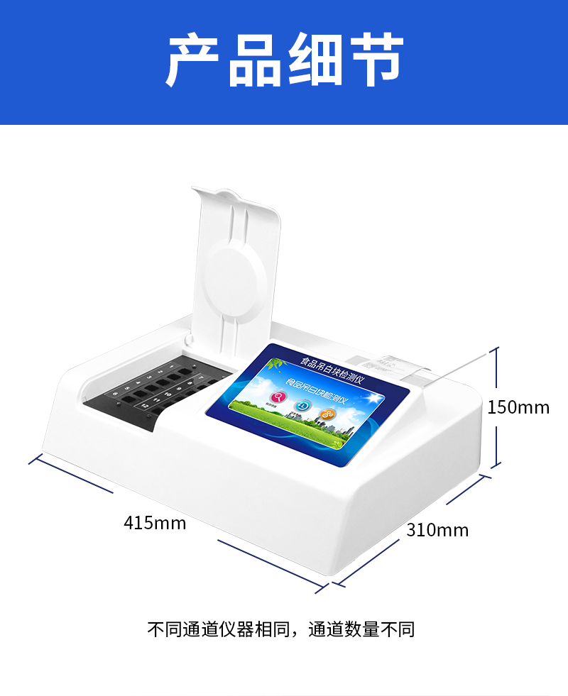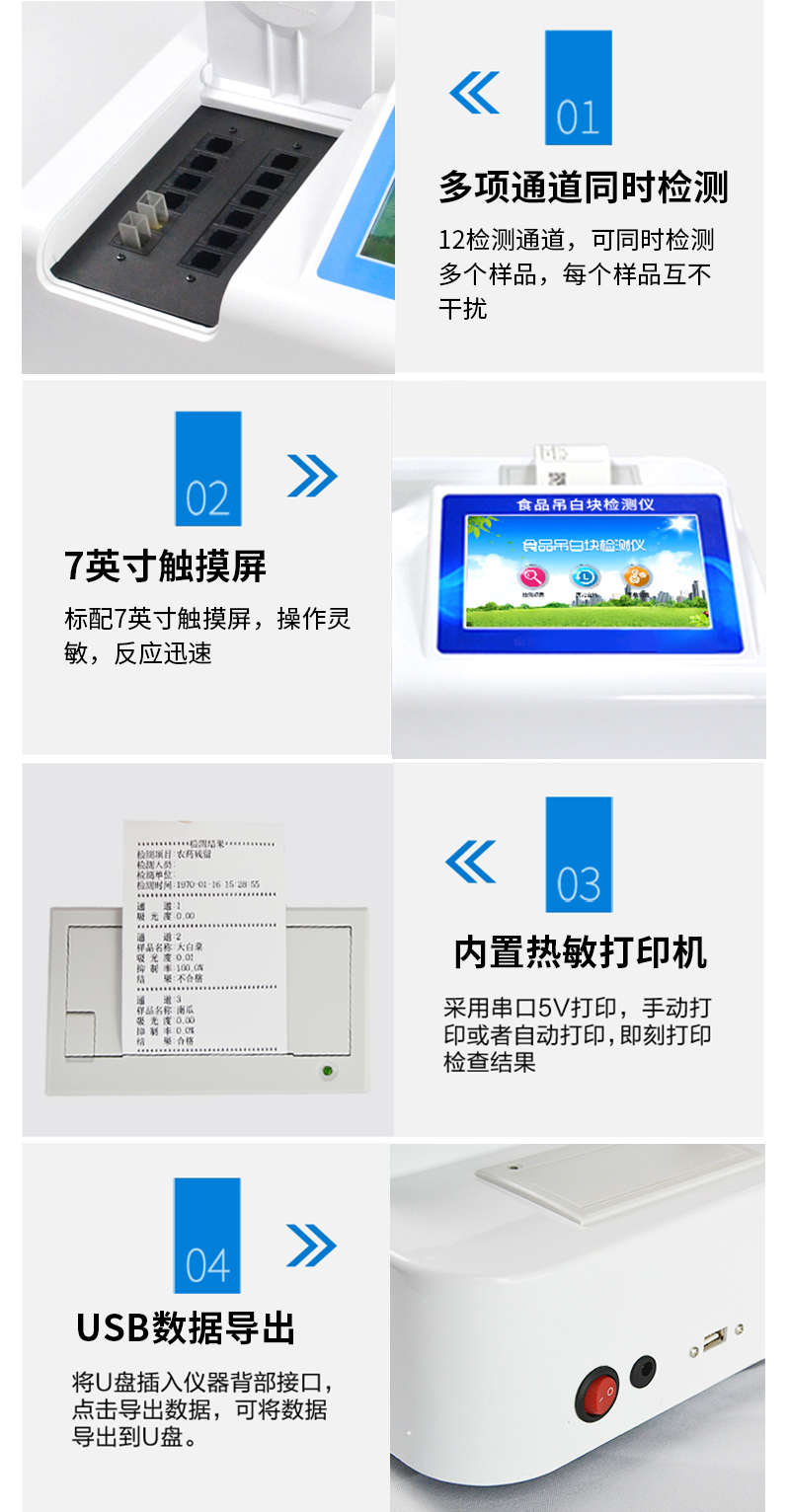 儀器采用臺(tái)式一體化系統(tǒng)檢測(cè)技術(shù),將分光光度模塊、新型農(nóng)殘檢測(cè)模塊、數(shù)字化管理模塊、無(wú)線通訊模塊高度集成于一體,支持檢測(cè)200種食品安全檢測(cè)項(xiàng)目,同時(shí)預(yù)留升級(jí)檢測(cè)方法。儀器檢測(cè)模塊標(biāo)準(zhǔn)化、智能化,可隨意自由組合。檢測(cè)箱體內(nèi)置多個(gè)標(biāo)準(zhǔn)檢測(cè)單元,檢測(cè)模塊可以調(diào)整配置。儀器采用全新安卓智能系統(tǒng),主控芯片采用 ARM Cortex-A7,RK3288/4核處理器,10.1寸高清液晶觸摸豎屏,更加**的UI交互界面,運(yùn)轉(zhuǎn)快捷;儀器配備無(wú)線通信模塊: 4G(APN)通訊模塊、Wifi模塊,藍(lán)牙傳輸,同時(shí)具有雙USB接口以及RJ45接口能以多種方式實(shí)現(xiàn)數(shù)據(jù)保存和數(shù)據(jù)傳輸功能。創(chuàng)新檢測(cè)模式:★檢測(cè)通道:≥12通道;采用精密旋轉(zhuǎn)比色池設(shè)計(jì),使用同芯片同光源校準(zhǔn)精度,解決不同光源之間的誤差值。1-12通道間誤差0.1%。(***:**202022821055.2)★儀器具有自動(dòng)識(shí)別比色皿檢測(cè)功能,即:將樣品比色皿放入儀器后,點(diǎn)擊樣品檢測(cè),儀器自動(dòng)識(shí)別比色皿進(jìn)行通道檢測(cè)。進(jìn)口高精光源:高精度進(jìn)口四波長(zhǎng)冷光源,通道配置 410、520、590、630nm 波長(zhǎng)光源,一個(gè)光源芯片驅(qū)動(dòng)一個(gè)光源,誤差極小,每臺(tái)設(shè)備單獨(dú)**校準(zhǔn)光源,**比對(duì),同時(shí)參照四種不同波段光源全方位覆蓋市面上99%的農(nóng)殘食品項(xiàng)目檢測(cè)。智能化操作系統(tǒng):便捷操作系統(tǒng):設(shè)備檢測(cè)時(shí)可在同一檢測(cè)界面自動(dòng)對(duì)應(yīng)相關(guān)檢測(cè)通道一次性選擇1-12個(gè)樣品名稱,無(wú)須退出界面,節(jié)省操作時(shí)間。數(shù)據(jù)集成系統(tǒng):設(shè)備首頁(yè)自動(dòng)統(tǒng)計(jì)檢測(cè)數(shù)據(jù)包含:周檢測(cè)數(shù)據(jù)、月檢測(cè)數(shù)據(jù),全部檢測(cè)總數(shù)量,均包含檢測(cè)總數(shù),合格數(shù),不合格數(shù),以及相關(guān)柱形分析圖,對(duì)各項(xiàng)檢測(cè)數(shù)據(jù)清晰掌握,無(wú)需電腦查詢,更加快捷直觀。項(xiàng)目預(yù)設(shè)系統(tǒng):支持添加單個(gè)及多個(gè)相同或不相同的任務(wù)預(yù)設(shè),一鍵快速調(diào)取,每一個(gè)任務(wù)分別可以設(shè)置不同的樣品、批次、編號(hào)、來(lái)源、備注、抽樣信息、檢測(cè)信息、受檢信息、復(fù)核信息等更多信息。無(wú)縫鏈接平臺(tái)和APP實(shí)時(shí)查看下發(fā)任務(wù)。數(shù)據(jù)監(jiān)管系統(tǒng):同步對(duì)接監(jiān)管平臺(tái),數(shù)據(jù)可局域網(wǎng)和互聯(lián)網(wǎng)數(shù)據(jù)上傳,檢測(cè)結(jié)果可選擇直接傳至食品安全監(jiān)管平臺(tái)。集成OSS輸出存儲(chǔ)服務(wù)、區(qū)分設(shè)備定向管理應(yīng)用,進(jìn)行區(qū)域食品安全監(jiān)管及大數(shù)據(jù)分析處理與數(shù)據(jù)統(tǒng)計(jì),檢測(cè)區(qū)域食品安全長(zhǎng)短期動(dòng)態(tài),達(dá)到食品安全問(wèn)題預(yù)估、預(yù)警。自定義打印系統(tǒng):內(nèi)置全新打印系統(tǒng),新創(chuàng)自定義打印方式,可按需靈活設(shè)置開啟或關(guān)閉:產(chǎn)品合格證(國(guó)家農(nóng)業(yè)部標(biāo)準(zhǔn)要求),二維碼,抽樣信息、檢測(cè)信息,受檢信息、復(fù)核信息、抽樣日期、檢測(cè)日期等信息的打印。系統(tǒng)遠(yuǎn)程更新功能:可定向分客戶分儀器更新系統(tǒng),按照不同客戶后期實(shí)際需求添加項(xiàng)目,無(wú)需機(jī)器返廠,即可遠(yuǎn)程實(shí)時(shí)升級(jí)全新系統(tǒng),節(jié)省時(shí)間成本及避免運(yùn)輸造成設(shè)備損壞。儀器主機(jī)采用一體化防水、抗壓、防撞擊、防腐蝕箱體設(shè)計(jì),同時(shí)配備交直流供電,可連接車載電源,可選配大容量充電鋰電池,滿足現(xiàn)場(chǎng)野外檢測(cè)需求。安全證書,放心保障:儀器具有中國(guó)計(jì)量科學(xué)研究院校準(zhǔn)證書,權(quán)威認(rèn)證。