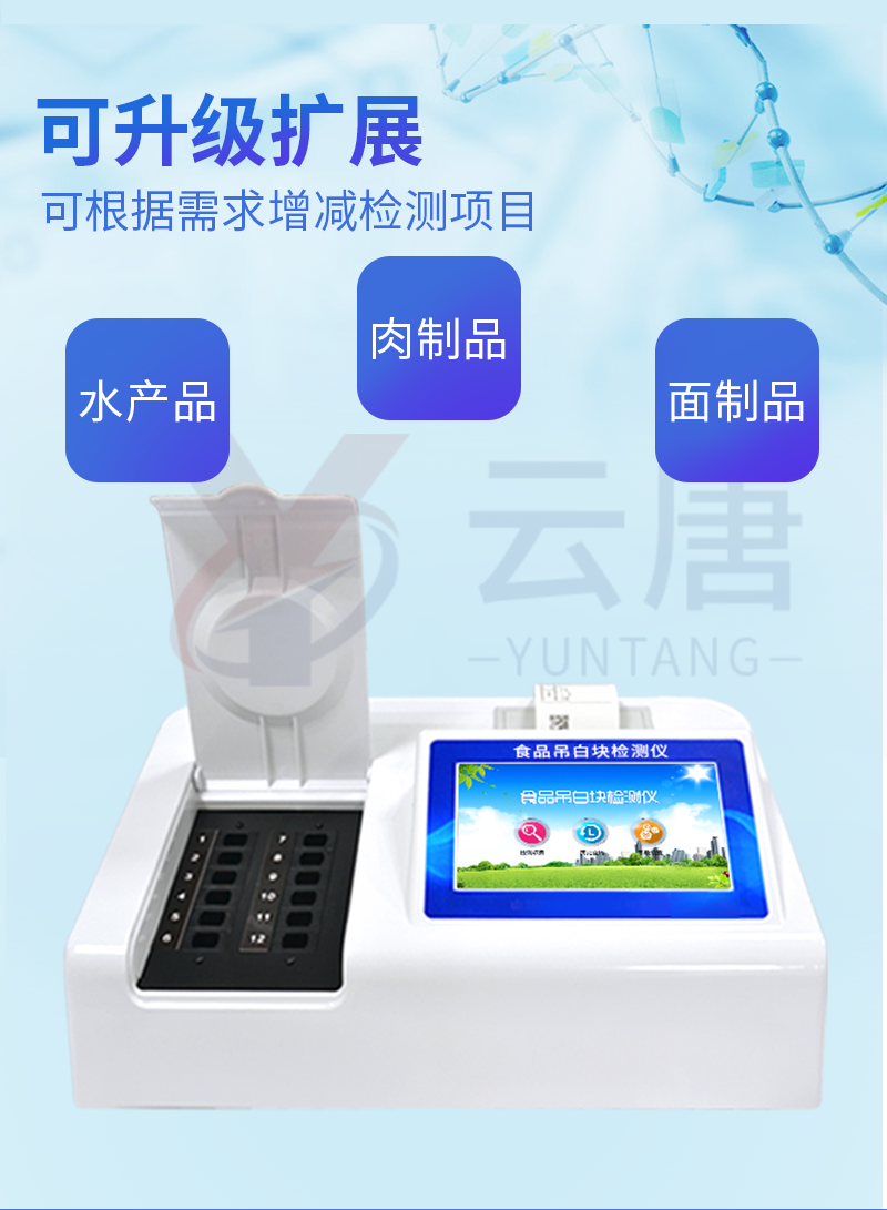 用于快速檢測(cè)食品中吊白塊,儀器預(yù)留其他項(xiàng)目檢測(cè)程序和端口,根據(jù)日后需求可方便的自主增加檢測(cè)項(xiàng)目。日后可升級(jí)為檢測(cè),水產(chǎn)品,肉制品,面制品的綜合類型儀器。