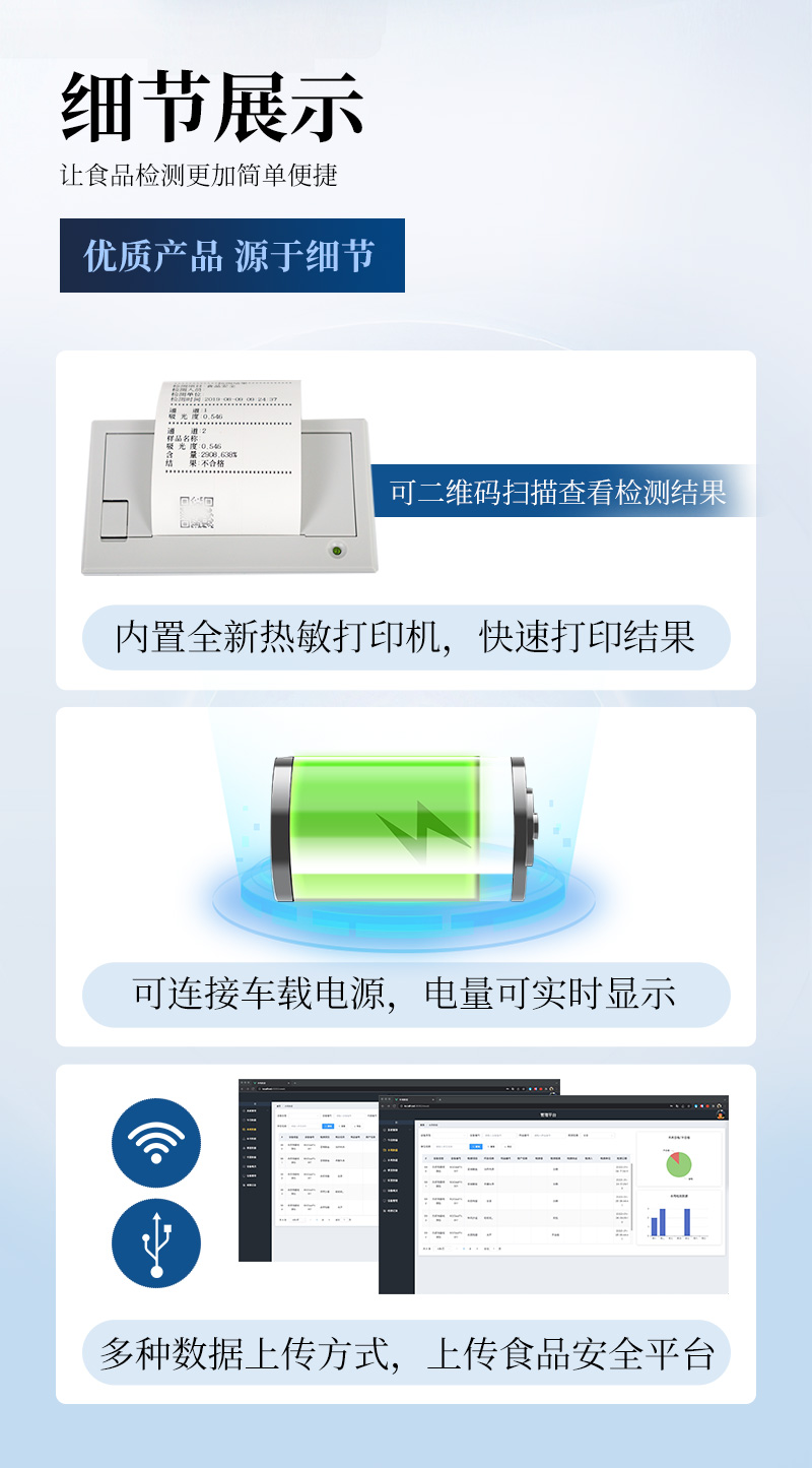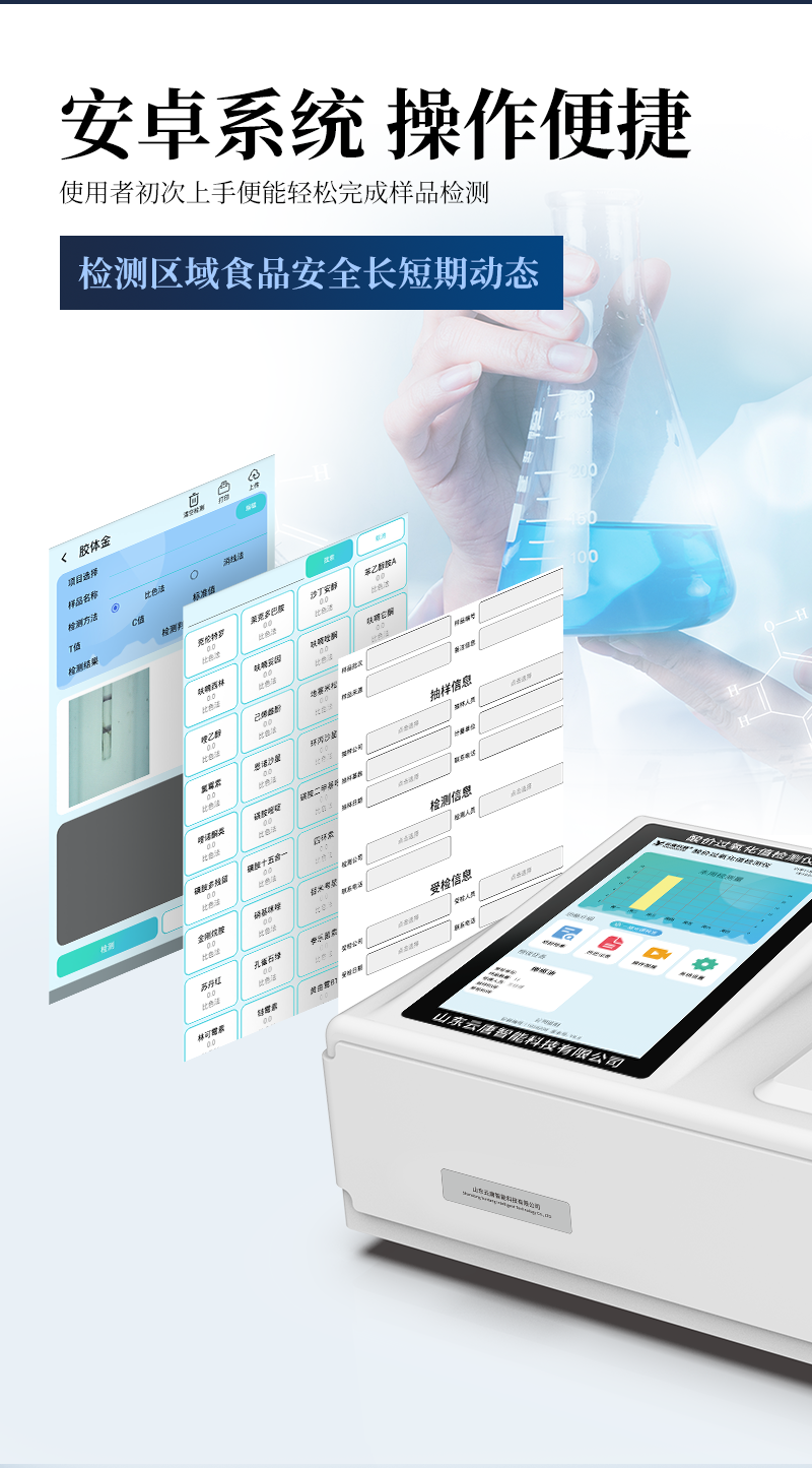 | 1、儀器采用臺式一體化系統(tǒng)檢測技術,將分光光度模塊、膠體金檢測模塊、新型農(nóng)殘檢測模塊、數(shù)字化管理模塊、無線通訊模塊高度集成于一體,支持檢測200種食品安全檢測項目,同時預留升級檢測方法。 | 2、儀器檢測模塊標準化、智能化,檢測項目可隨意自由組合。檢測箱體內(nèi)置多個標準檢測單元,檢測模塊可以調(diào)整配置。 | 3、顯示屏幕:儀器采用10.1英寸豎向液晶觸摸屏顯,搭配運行安卓智能操作系統(tǒng),主控芯片采用ARM Cortex-A7,RK3288/4核處理器,主頻1.88Ghz,操作方便,性能更強。 | 4、檢測通道:≥12通道;采用精密旋轉(zhuǎn)比色池設計,使用同芯片同光源校準精度,解決不同光源之間的誤差值,更加準確**。(1-12通道間誤差0.1%,***:**202022821055.2) | 5、儀器光源:高精度進口四波長冷光源,每個通道均配置 410、520、590、630nm 波長光源,標配**的光路切換裝置,專利光路切換功能可實現(xiàn)64波長,并且所有檢測項目可實現(xiàn)所有通道同時檢測。 | 6、設備可一鍵校準,自動保存校準數(shù)據(jù),自動對比校驗,得到精準光源,采用Android SP存儲數(shù)據(jù),光源數(shù)據(jù)永不丟失,方便每一次使用。 | 7、通訊接口:配備無線通信模塊、4G(APN)通訊模塊、藍牙傳輸,同時具有雙USB接口以及RJ45網(wǎng)線接口,可以多方式實現(xiàn)數(shù)據(jù)保存及數(shù)據(jù)傳輸。 | 8、存儲方式:支持U盤存儲,標準USB接口,免驅(qū)動安裝。檢測結果存儲容量20萬條以上,可生成Excel表格進行拷貝,并具有登錄保護功能。 | 9、智能化操作系統(tǒng): | 9.1、操作系統(tǒng):儀器可在同一檢測界面自動對應相關檢測通道,一次性選擇1-12個樣品名稱,無需退出界面,節(jié)省操作時間。并可以對每個通道屬性和樣品信息單獨進行編輯,例如送檢單位、人員,檢測人員等,打印時勾選打印顯示。 | 9.2、數(shù)據(jù)集成系統(tǒng):設備首頁自動匯總分析檢測數(shù)據(jù),包含:周檢測數(shù)據(jù)、月檢測數(shù)據(jù),全部檢測總數(shù)量,均包含檢測總數(shù),合格數(shù),不合格數(shù),以及相關柱形分析圖,各項檢測數(shù)據(jù)一目了然,無需電腦查詢,更加快捷直觀。 | 9.3、數(shù)據(jù)庫系統(tǒng):十幾項數(shù)據(jù)庫分類管理儀器:包含項目類型、項目數(shù)據(jù)、檢測數(shù)據(jù)、歷史記錄、國標信息、曲線信息、采樣信息、檢測信息、受檢信息、復核信息、圖表信息、光源校準信息、打印樣式信息、樣品庫信息等等,數(shù)據(jù)庫之間互相協(xié)調(diào)聯(lián)動保證數(shù)據(jù)的真實完整性。同時產(chǎn)品數(shù)據(jù)庫以及歷史檢測記錄支持一鍵檢索功能。 | 9.4、限量規(guī)判系統(tǒng):具有限量查詢、添加物質(zhì)合規(guī)判定系統(tǒng)。檢測出結果后,系統(tǒng)自動調(diào)用系統(tǒng)數(shù)據(jù)庫中相關國標進行比對判定,客觀顯示判定結果是否合格。 | 9.5、項目預設系統(tǒng):儀器具有任務預設模塊,一鍵提前預設,給出方便快捷的新檢測方案,每一個任務分別可以設置不同的樣品、批次、編號、來源、備注、抽樣信息、檢測信息、受檢信息、復核信息等更多信息。樣品送檢時一鍵調(diào)取保存信息,并可多次調(diào)取,大大提高檢測效率。 | 9.6、數(shù)據(jù)監(jiān)管系統(tǒng):同步對接監(jiān)管平臺,數(shù)據(jù)可局域網(wǎng)和互聯(lián)網(wǎng)數(shù)據(jù)上傳,檢測結果可選擇直接傳至食品安全監(jiān)管平臺。進行區(qū)域食品安全監(jiān)管及大數(shù)據(jù)分析處理與數(shù)據(jù)統(tǒng)計,檢測區(qū)域食品安全長短期動態(tài),達到食品安全問題預估、預警。 | 9.7.1、全新打印系統(tǒng):內(nèi)置全新打印機,新創(chuàng)自定義打印方式,可按需靈活勾選控制:產(chǎn)品合格證(國家農(nóng)業(yè)部標準要求),二維碼,抽樣信息、檢測信息,受檢信息、復核信息、抽樣日期、檢測日期等信息的打印。 | 9.7.2、A4紙版本報告打印功能(選配):設備擁有兩種結果展示方式,可以自動生成A4打印模板和小票打印模板兩種樣式,可通過WiFi及網(wǎng)線等方式鏈接外置打印機可進行打印。 | 10、供電模式:儀器交直流兩用,直流12V供電,可連接車載電源,可配6ah大容量充電鋰電池,電量可實時顯示,方便戶外流動測試。 | 11、膠體金檢測模塊:采用單通道CMOS成像處理技術及膠體金免疫層析技術,可讀取膠體金卡數(shù)據(jù),自動采集、處理分析,將檢測結果顯示,并可根據(jù)參考限值自動判斷檢測結果,可檢測常見的獸藥殘留、生物毒素、抗生素、違禁添加物等。 | 11.1、探測技術:CMOS成像探測; | 11.2、檢測通道:1個通道; | 11.3、檢測方式:消線法和比色法; | 11.4、顯示模式:陰性或陽性; | 11.5、曲線形式:直插式掃描方式,顯示金標卡圖像,實時生成、識別CT曲線圖,無需手動調(diào)整,完成檢測后自動退出檢測卡。兼容市場上其他金標卡,使用耗材不受限制。 | 12、儀器具備遠程升級功能,可定向分客戶分儀器更新,開機后自動更新,并可持續(xù)性免費更新系統(tǒng)版本,無需像傳統(tǒng)產(chǎn)品返廠更新,節(jié)省時間及人力成本并避免了物流運輸返廠升級導致設備損壞的潛在風險。 |