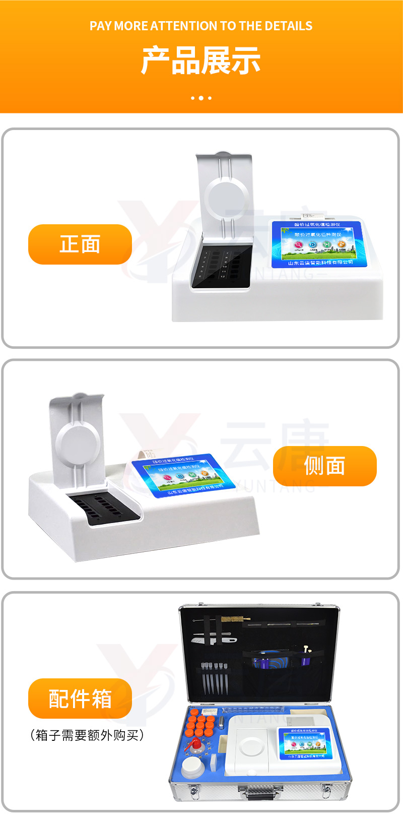 儀器采用臺(tái)式一體化系統(tǒng)檢測(cè)技術(shù),將分光光度模塊、新型農(nóng)殘檢測(cè)模塊、數(shù)字化管理模塊、無(wú)線通訊模塊高度集成于一體,支持檢測(cè)200種食品安全檢測(cè)項(xiàng)目,同時(shí)預(yù)留升級(jí)檢測(cè)方法。儀器檢測(cè)模塊標(biāo)準(zhǔn)化、智能化,可隨意自由組合。檢測(cè)箱體內(nèi)置多個(gè)標(biāo)準(zhǔn)檢測(cè)單元,檢測(cè)模塊可以調(diào)整配置。儀器采用全新安卓智能系統(tǒng),主控芯片采用 ARM Cortex-A7,RK3288/4核處理器,10.1寸高清液晶觸摸豎屏,更加**的UI交互界面,運(yùn)轉(zhuǎn)快捷;儀器配備無(wú)線通信模塊: 4G(APN)通訊模塊、Wifi模塊,藍(lán)牙傳輸,同時(shí)具有雙USB接口以及RJ45接口能以多種方式實(shí)現(xiàn)數(shù)據(jù)保存和數(shù)據(jù)傳輸功能。創(chuàng)新檢測(cè)模式:★檢測(cè)通道:≥12通道;采用精密旋轉(zhuǎn)比色池設(shè)計(jì),使用同芯片同光源校準(zhǔn)精度,解決不同光源之間的誤差值。1-12通道間誤差0.1%。(***:**202022821055.2)★儀器具有自動(dòng)識(shí)別比色皿檢測(cè)功能,即:將樣品比色皿放入儀器后,點(diǎn)擊樣品檢測(cè),儀器自動(dòng)識(shí)別比色皿進(jìn)行通道檢測(cè)。進(jìn)口高精光源:高精度進(jìn)口四波長(zhǎng)冷光源,通道配置 410、520、590、630nm 波長(zhǎng)光源,一個(gè)光源芯片驅(qū)動(dòng)一個(gè)光源,誤差極小,每臺(tái)設(shè)備單獨(dú)**校準(zhǔn)光源,**比對(duì),同時(shí)參照四種不同波段光源全方位覆蓋市面上99%的農(nóng)殘食品項(xiàng)目檢測(cè)。智能化操作系統(tǒng):便捷操作系統(tǒng):設(shè)備檢測(cè)時(shí)可在同一檢測(cè)界面自動(dòng)對(duì)應(yīng)相關(guān)檢測(cè)通道一次性選擇1-12個(gè)樣品名稱,無(wú)須退出界面,節(jié)省操作時(shí)間。數(shù)據(jù)集成系統(tǒng):設(shè)備首頁(yè)自動(dòng)統(tǒng)計(jì)檢測(cè)數(shù)據(jù)包含:周檢測(cè)數(shù)據(jù)、月檢測(cè)數(shù)據(jù),全部檢測(cè)總數(shù)量,均包含檢測(cè)總數(shù),合格數(shù),不合格數(shù),以及相關(guān)柱形分析圖,對(duì)各項(xiàng)檢測(cè)數(shù)據(jù)清晰掌握,無(wú)需電腦查詢,更加快捷直觀。項(xiàng)目預(yù)設(shè)系統(tǒng):支持添加單個(gè)及多個(gè)相同或不相同的任務(wù)預(yù)設(shè),一鍵快速調(diào)取,每一個(gè)任務(wù)分別可以設(shè)置不同的樣品、批次、編號(hào)、來(lái)源、備注、抽樣信息、檢測(cè)信息、受檢信息、復(fù)核信息等更多信息。無(wú)縫鏈接平臺(tái)和APP實(shí)時(shí)查看下發(fā)任務(wù)。數(shù)據(jù)監(jiān)管系統(tǒng):同步對(duì)接監(jiān)管平臺(tái),數(shù)據(jù)可局域網(wǎng)和互聯(lián)網(wǎng)數(shù)據(jù)上傳,檢測(cè)結(jié)果可選擇直接傳至食品安全監(jiān)管平臺(tái)。集成OSS輸出存儲(chǔ)服務(wù)、區(qū)分設(shè)備定向管理應(yīng)用,進(jìn)行區(qū)域食品安全監(jiān)管及大數(shù)據(jù)分析處理與數(shù)據(jù)統(tǒng)計(jì),檢測(cè)區(qū)域食品安全長(zhǎng)短期動(dòng)態(tài),達(dá)到食品安全問(wèn)題預(yù)估、預(yù)警。自定義打印系統(tǒng):內(nèi)置全新打印系統(tǒng),新創(chuàng)自定義打印方式,可按需靈活設(shè)置開(kāi)啟或關(guān)閉:產(chǎn)品合格證(國(guó)家農(nóng)業(yè)部標(biāo)準(zhǔn)要求),二維碼,抽樣信息、檢測(cè)信息,受檢信息、復(fù)核信息、抽樣日期、檢測(cè)日期等信息的打印。系統(tǒng)遠(yuǎn)程更新功能:可定向分客戶分儀器更新系統(tǒng),按照不同客戶后期實(shí)際需求添加項(xiàng)目,無(wú)需機(jī)器返廠,即可遠(yuǎn)程實(shí)時(shí)升級(jí)全新系統(tǒng),節(jié)省時(shí)間成本及避免運(yùn)輸造成設(shè)備損壞。儀器主機(jī)采用一體化防水、抗壓、防撞擊、防腐蝕箱體設(shè)計(jì),同時(shí)配備交直流供電,可連接車(chē)載電源,可選配大容量充電鋰電池,滿足現(xiàn)場(chǎng)野外檢測(cè)需求。安全證書(shū),放心保障:儀器具有中國(guó)計(jì)量科學(xué)研究院校準(zhǔn)證書(shū),權(quán)威認(rèn)證。