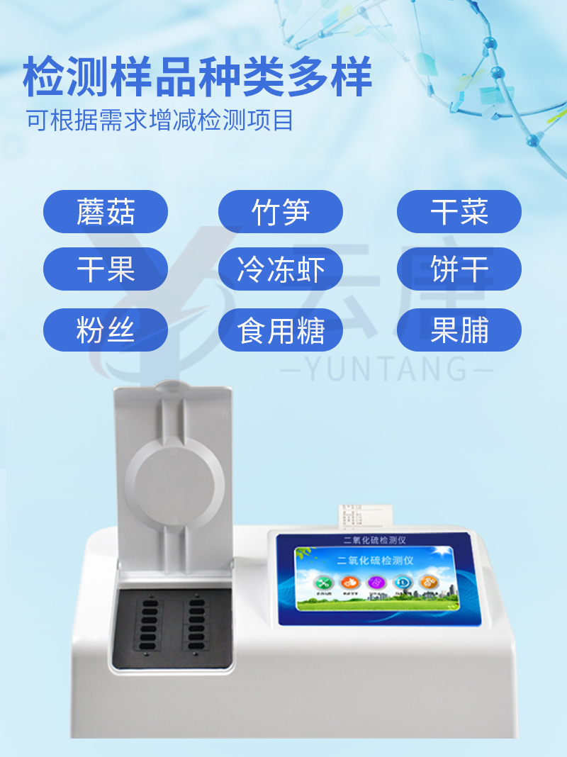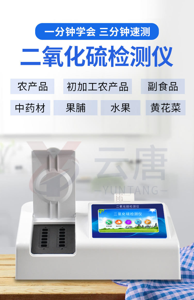 YT-R12二氧化硫檢測儀采用比色方法符合《GB/T5009.34—2003食品中亞硫酸鹽的測定》二氧化硫檢測儀廣泛應(yīng)用于、果脯、糖類、酒類、各類干果、草藥、水產(chǎn)品、肉類干鮮品及肉制品中的二氧化硫含量測定。