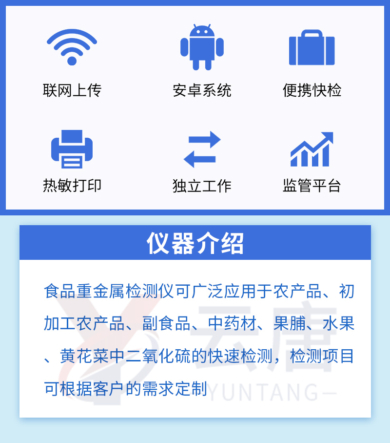 | 儀器采用臺式一體化系統(tǒng)檢測技術(shù),將分光光度模塊、新型農(nóng)殘檢測模塊、數(shù)字化管理模塊、無線通訊模塊高度集成于一體,支持檢測200種食品安全檢測項(xiàng)目,同時(shí)預(yù)留升級檢測方法。 | 儀器檢測模塊標(biāo)準(zhǔn)化、智能化,可隨意自由組合。檢測箱體內(nèi)置多個(gè)標(biāo)準(zhǔn)檢測單元,檢測模塊可以調(diào)整配置。 | 儀器采用全新安卓智能系統(tǒng),主控芯片采用 ARM Cortex-A7,RK3288/4核處理器,10.1寸高清液晶觸摸豎屏,更加**的UI交互界面,運(yùn)轉(zhuǎn)快捷;儀器配備無線通信模塊: 4G(APN)通訊模塊、Wifi模塊,藍(lán)牙傳輸,同時(shí)具有雙USB接口以及RJ45接口能以多種方式實(shí)現(xiàn)數(shù)據(jù)保存和數(shù)據(jù)傳輸功能。 | 創(chuàng)新檢測模式: | ★檢測通道:≥12通道;采用精密旋轉(zhuǎn)比色池設(shè)計(jì),使用同芯片同光源校準(zhǔn)精度,解決不同光源之間的誤差值。1-12通道間誤差0.1%。(***:**202022821055.2) | ★儀器具有自動(dòng)識別比色皿檢測功能,即:將樣品比色皿放入儀器后,點(diǎn)擊樣品檢測,儀器自動(dòng)識別比色皿進(jìn)行通道檢測。 | 進(jìn)口高精光源: | 高精度進(jìn)口四波長冷光源,通道配置 410、520、590、630nm 波長光源,一個(gè)光源芯片驅(qū)動(dòng)一個(gè)光源,誤差極小,每臺設(shè)備單獨(dú)**校準(zhǔn)光源,**比對,同時(shí)參照四種不同波段光源全方位覆蓋市面上99%的農(nóng)殘食品項(xiàng)目檢測。 | 智能化操作系統(tǒng): | 便捷操作系統(tǒng):設(shè)備檢測時(shí)可在同一檢測界面自動(dòng)對應(yīng)相關(guān)檢測通道一次性選擇1-12個(gè)樣品名稱,無須退出界面,節(jié)省操作時(shí)間。 | 數(shù)據(jù)集成系統(tǒng):設(shè)備首頁自動(dòng)統(tǒng)計(jì)檢測數(shù)據(jù)包含:周檢測數(shù)據(jù)、月檢測數(shù)據(jù),全部檢測總數(shù)量,均包含檢測總數(shù),合格數(shù),不合格數(shù),以及相關(guān)柱形分析圖,對各項(xiàng)檢測數(shù)據(jù)清晰掌握,無需電腦查詢,更加快捷直觀。 | 項(xiàng)目預(yù)設(shè)系統(tǒng):支持添加單個(gè)及多個(gè)相同或不相同的任務(wù)預(yù)設(shè),一鍵快速調(diào)取,每一個(gè)任務(wù)分別可以設(shè)置不同的樣品、批次、編號、來源、備注、抽樣信息、檢測信息、受檢信息、復(fù)核信息等更多信息。無縫鏈接平臺和APP實(shí)時(shí)查看下發(fā)任務(wù)。 | 數(shù)據(jù)監(jiān)管系統(tǒng):同步對接監(jiān)管平臺,數(shù)據(jù)可局域網(wǎng)和互聯(lián)網(wǎng)數(shù)據(jù)上傳,檢測結(jié)果可選擇直接傳至食品安全監(jiān)管平臺。集成OSS輸出存儲(chǔ)服務(wù)、區(qū)分設(shè)備定向管理應(yīng)用,進(jìn)行區(qū)域食品安全監(jiān)管及大數(shù)據(jù)分析處理與數(shù)據(jù)統(tǒng)計(jì),檢測區(qū)域食品安全長短期動(dòng)態(tài),達(dá)到食品安全問題預(yù)估、預(yù)警。 | 自定義打印系統(tǒng):內(nèi)置全新打印系統(tǒng),新創(chuàng)自定義打印方式,可按需靈活設(shè)置開啟或關(guān)閉:產(chǎn)品合格證(國家農(nóng)業(yè)部標(biāo)準(zhǔn)要求),二維碼,抽樣信息、檢測信息,受檢信息、復(fù)核信息、抽樣日期、檢測日期等信息的打印。 | 系統(tǒng)遠(yuǎn)程更新功能:可定向分客戶分儀器更新系統(tǒng),按照不同客戶后期實(shí)際需求添加項(xiàng)目,無需機(jī)器返廠,即可遠(yuǎn)程實(shí)時(shí)升級全新系統(tǒng),節(jié)省時(shí)間成本及避免運(yùn)輸造成設(shè)備損壞。 | 儀器主機(jī)采用一體化防水、抗壓、防撞擊、防腐蝕箱體設(shè)計(jì),同時(shí)配備交直流供電,可連接車載電源,可選配大容量充電鋰電池,滿足現(xiàn)場野外檢測需求。 | 安全證書,放心保障:儀器具有中國計(jì)量科學(xué)研究院校準(zhǔn)證書,權(quán)威認(rèn)證。 |