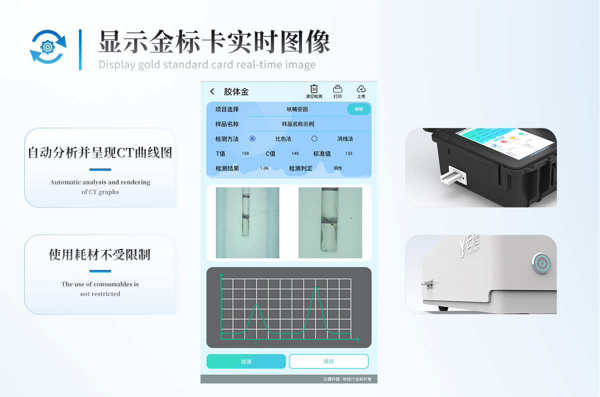 儀器采用10.1英寸液晶觸摸屏顯,搭配運行安卓智能操作系統(tǒng),主控芯片采用ARM Cortex-A7,RK3288/4核處理器,主頻1.88Ghz,運轉(zhuǎn)速度更快速,性能更強。儀器功能包括:膠體金檢測模塊、數(shù)字化管理模塊、無線通訊模塊等,可以滿足同一軟件下實現(xiàn)所有檢測項目的檢測,并在同一窗口展示檢測結(jié)果。一體化便攜式快檢設備,采用交直流兩用供電方式,可連接車載電源,配備6ah大容量充電鋰電池,可以滿足現(xiàn)場及流動檢測使用的需求。儀器尺寸:43×35×20cm,   主機凈重:5.1kg系統(tǒng)自帶數(shù)據(jù)集成模塊,設備首頁自動統(tǒng)計檢測數(shù)據(jù)包含:周檢測數(shù)據(jù)、月檢測數(shù)據(jù),全部檢測總數(shù)量,均包含檢測總數(shù),合格數(shù),不合格數(shù),以及相關柱形分析圖,對各項檢測數(shù)據(jù)清晰掌握,無需電腦查詢,更加快捷直觀。儀器具有任務預設模塊,可在樣品送檢前提前預設樣品名稱、檢測指標、送檢單位等信息,樣品送檢時一鍵調(diào)取保存信息,檢測更加方便快捷。軌道式自動傳輸掃描方式,可實時顯示金標卡實時圖像,系統(tǒng)自動分析并呈現(xiàn)出CT曲線圖,CT線自動識別,無需手動調(diào)整,完成檢測后自動退出檢測卡。結(jié)果判定線可修改,對照值標定值可保存,斷電不丟失數(shù)據(jù)。兼容市場上其他膠體金卡,使用耗材不受限制,極大增強用戶使用體驗。儀器檢測系統(tǒng)擁有龐大數(shù)據(jù)庫,并且構(gòu)建了完善的檢索、修訂功能。食品庫涵蓋多種樣品名稱,可按需添加或刪除、編輯樣品名稱;產(chǎn)品數(shù)據(jù)庫以及歷史檢測記錄支持一鍵檢索功能。系統(tǒng)打印自定義化,打印格式多樣化,產(chǎn)品合格證(國家標準要求),二維碼,抽樣信息、檢測信息,受檢信息、復核信息、抽樣日期、檢測日期等信息結(jié)果,可按需求自行設置打印內(nèi)容。A4紙版本報告打印功能(可選配):設備擁有兩種結(jié)果展示方式,可以自動生成A4打印模板和小票打印模板兩種樣式,可通過WiFi及網(wǎng)線等方式鏈接外置打印機可進行打印儀器具有 wifi 聯(lián)網(wǎng)上傳、RJ45網(wǎng)線連接功能,可以快速上傳數(shù)據(jù)。同步對接監(jiān)管平臺,數(shù)據(jù)可局域網(wǎng)和互聯(lián)網(wǎng)數(shù)據(jù)上傳,檢測結(jié)果直接傳至食品安全監(jiān)管平臺。進行區(qū)域食品安全監(jiān)管及大數(shù)據(jù)分析處理與數(shù)據(jù)統(tǒng)計,檢測區(qū)域食品安全長短期動態(tài),達到食品安全問題預估、預警。設備支持U盤存儲,標準USB接口,免驅(qū)動安裝。檢測結(jié)果存儲容量20萬條以上,可生成Excel表格,進行一鍵拷貝,并具有登錄保護功能,可設置用戶名及密碼,規(guī)范不同人員操作權(quán)限,防止非工作人員操作,并且可以進行重新校準、鎖定、恢復出廠設置功能。儀器固件可升級,后期檢測項目可擴充。儀器具有重新校準、鎖定、恢復出廠設置功能。儀器具備遠程升級功能,可定向分客戶分儀器更新,開機后自動更新,并可持續(xù)性免費更新系統(tǒng)版本,無需像傳統(tǒng)產(chǎn)品返廠更新,節(jié)省時間及人力成本并避免了物流運輸返廠升級導致設備損壞的潛在風險。