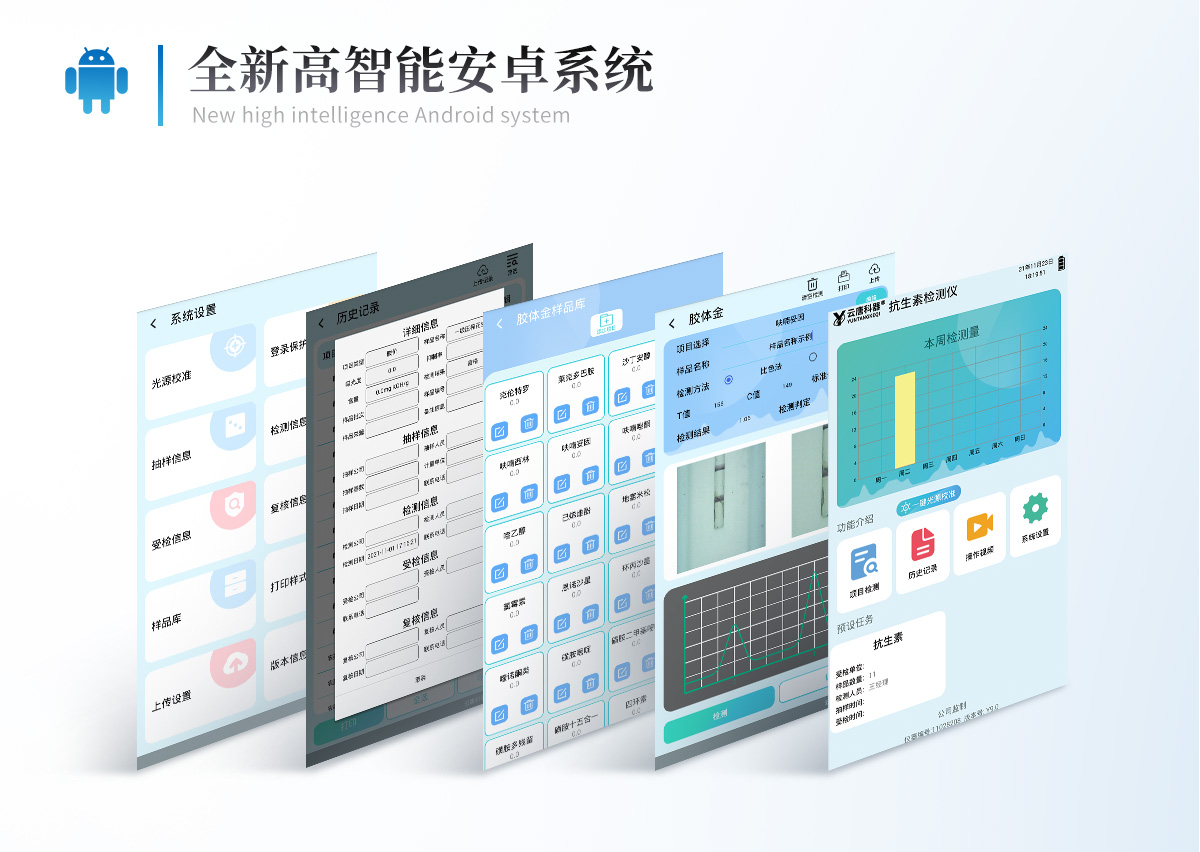 | 儀器采用10.1英寸液晶觸摸屏顯,搭配運(yùn)行安卓智能操作系統(tǒng),主控芯片采用ARM Cortex-A7,RK3288/4核處理器,主頻1.88Ghz,運(yùn)轉(zhuǎn)速度更快速,性能更強(qiáng)。 | 儀器功能包括:膠體金檢測(cè)模塊、數(shù)字化管理模塊、無線通訊模塊等,可以滿足同一軟件下實(shí)現(xiàn)所有檢測(cè)項(xiàng)目的檢測(cè),并在同一窗口展示檢測(cè)結(jié)果。 | 一體化臺(tái)式快檢設(shè)備,采用交直流兩用供電方式,可連接車載電源,配備6ah大容量充電鋰電池,可以滿足現(xiàn)場(chǎng)及流動(dòng)檢測(cè)使用的需求。儀器尺寸:43×35×20cm, 主機(jī)凈重:5.1kg | 系統(tǒng)自帶數(shù)據(jù)集成模塊,設(shè)備首頁自動(dòng)統(tǒng)計(jì)檢測(cè)數(shù)據(jù)包含:周檢測(cè)數(shù)據(jù)、月檢測(cè)數(shù)據(jù),全部檢測(cè)總數(shù)量,均包含檢測(cè)總數(shù),合格數(shù),不合格數(shù),以及相關(guān)柱形分析圖,對(duì)各項(xiàng)檢測(cè)數(shù)據(jù)清晰掌握,無需電腦查詢,更加快捷直觀。 | 儀器具有任務(wù)預(yù)設(shè)模塊,可在樣品送檢前提前預(yù)設(shè)樣品名稱、檢測(cè)指標(biāo)、送檢單位等信息,樣品送檢時(shí)一鍵調(diào)取保存信息,檢測(cè)更加方便快捷。 | 直插式自動(dòng)掃描方式,可實(shí)時(shí)顯示金標(biāo)卡實(shí)時(shí)圖像,系統(tǒng)自動(dòng)分析并呈現(xiàn)出CT曲線圖,CT線自動(dòng)識(shí)別,無需手動(dòng)調(diào)整,完成檢測(cè)后自動(dòng)退出檢測(cè)卡。 | 結(jié)果判定線可修改,對(duì)照值標(biāo)定值可保存,斷電不丟失數(shù)據(jù)。 | 兼容市場(chǎng)上其他膠體金卡,使用耗材不受限制,極大增強(qiáng)用戶使用體驗(yàn)。 | 儀器檢測(cè)系統(tǒng)擁有龐大數(shù)據(jù)庫,并且構(gòu)建了完善的檢索、修訂功能。食品庫涵蓋多種樣品名稱,可按需添加或刪除、編輯樣品名稱;產(chǎn)品數(shù)據(jù)庫以及歷史檢測(cè)記錄支持一鍵檢索功能。 | 系統(tǒng)打印自定義化,打印格式多樣化,產(chǎn)品合格證(國家標(biāo)準(zhǔn)要求),二維碼,抽樣信息、檢測(cè)信息,受檢信息、復(fù)核信息、抽樣日期、檢測(cè)日期等信息結(jié)果,可按需求自行設(shè)置打印內(nèi)容。 | A4紙版本報(bào)告打印功能(可選配):設(shè)備擁有兩種結(jié)果展示方式,可以自動(dòng)生成A4打印模板和小票打印模板兩種樣式,可通過WiFi及網(wǎng)線等方式鏈接外置打印機(jī)可進(jìn)行打印 | 儀器具有 wifi 聯(lián)網(wǎng)上傳、RJ45網(wǎng)線連接功能,可以快速上傳數(shù)據(jù)。同步對(duì)接監(jiān)管平臺(tái),數(shù)據(jù)可局域網(wǎng)和互聯(lián)網(wǎng)數(shù)據(jù)上傳,檢測(cè)結(jié)果直接傳至食品安全監(jiān)管平臺(tái)。進(jìn)行區(qū)域食品安全監(jiān)管及大數(shù)據(jù)分析處理與數(shù)據(jù)統(tǒng)計(jì),檢測(cè)區(qū)域食品安全長(zhǎng)短期動(dòng)態(tài),達(dá)到食品安全問題預(yù)估、預(yù)警。 | 設(shè)備支持U盤存儲(chǔ),標(biāo)準(zhǔn)USB接口,免驅(qū)動(dòng)安裝。檢測(cè)結(jié)果存儲(chǔ)容量20萬條以上,可生成Excel表格,進(jìn)行一鍵拷貝,并具有登錄保護(hù)功能,可設(shè)置用戶名及密碼,規(guī)范不同人員操作權(quán)限,防止非工作人員操作,并且可以進(jìn)行重新校準(zhǔn)、鎖定、恢復(fù)出廠設(shè)置功能。儀器固件可升級(jí),后期檢測(cè)項(xiàng)目可擴(kuò)充。 | 儀器具有重新校準(zhǔn)、鎖定、恢復(fù)出廠設(shè)置功能。 | 儀器具備遠(yuǎn)程升級(jí)功能,可定向分客戶分儀器更新,開機(jī)后自動(dòng)更新,并可持續(xù)性免費(fèi)更新系統(tǒng)版本,無需像傳統(tǒng)產(chǎn)品返廠更新,節(jié)省時(shí)間及人力成本并避免了物流運(yùn)輸返廠升級(jí)導(dǎo)致設(shè)備損壞的潛在風(fēng)險(xiǎn)。 |