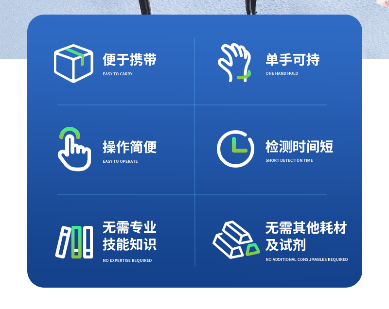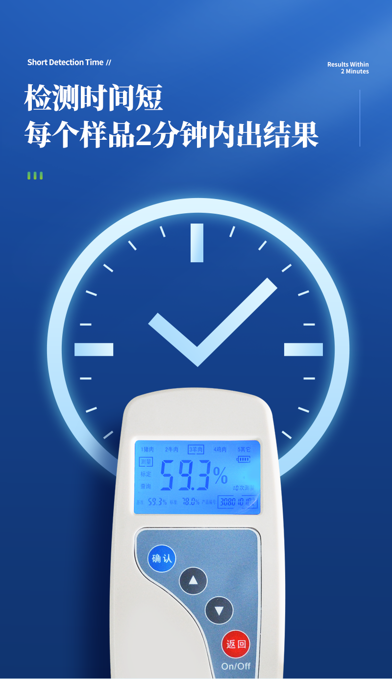 便于攜帶,單手可持可根據(jù)測定對(duì)象的品種,設(shè)定相應(yīng)的判斷標(biāo)準(zhǔn)值操作簡便,檢測人員無需專業(yè)技能知識(shí)檢測時(shí)間短,每個(gè)樣品2分鐘內(nèi)出結(jié)果;檢測試驗(yàn)無需其他耗材及試劑