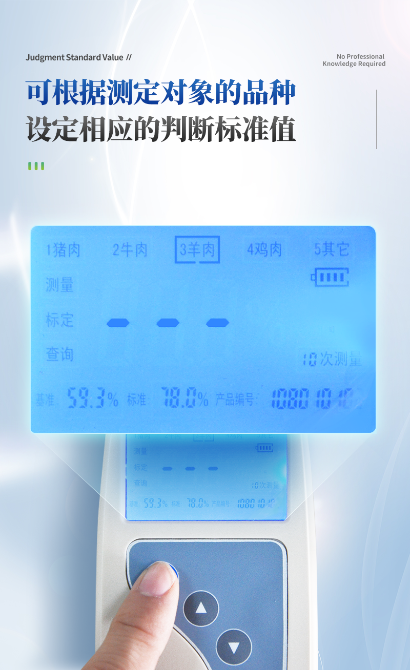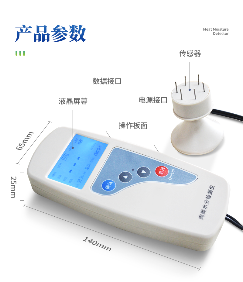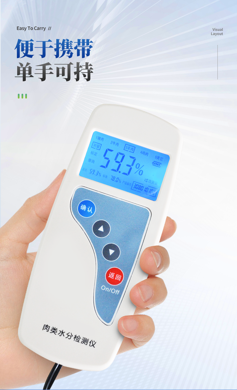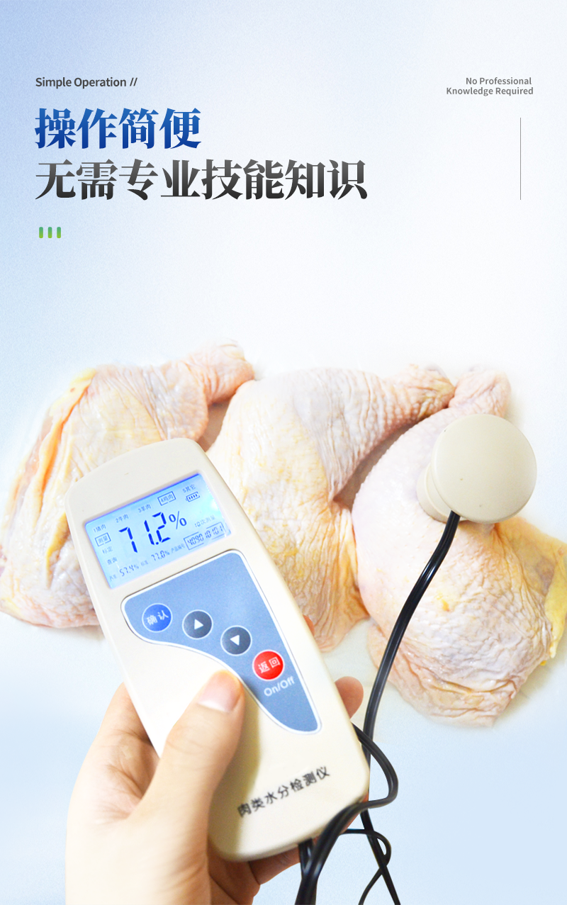 肉類水分檢測儀主要用于快速豬肉、牛肉、雞肉等動(dòng)物肉類水分含量,從而判斷所測樣品是否為注水肉,該儀器設(shè)計(jì)精巧,單手可持,儀器可根據(jù)測定對(duì)象的品種,設(shè)定相應(yīng)的判斷標(biāo)準(zhǔn)值。
