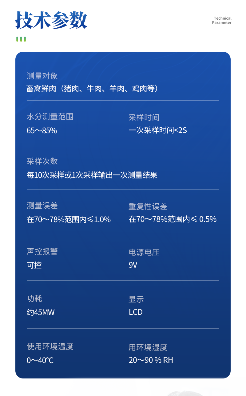 畜禽鮮肉(豬肉、牛肉、羊肉、雞肉等)65~85%一次采樣時(shí)間< 1s每10次采樣或1次采樣輸出一次測量結(jié)果在70~78%范圍內(nèi)≤1.0%在70~78%范圍內(nèi)≤ 0.5%超標(biāo)報(bào)警可設(shè)定每個(gè)品種的判斷標(biāo)準(zhǔn)。交直流兩用觸摸式按鍵45mW167×70×30mm藍(lán)色背光LCD0~40℃20~90 % RHUSB接口