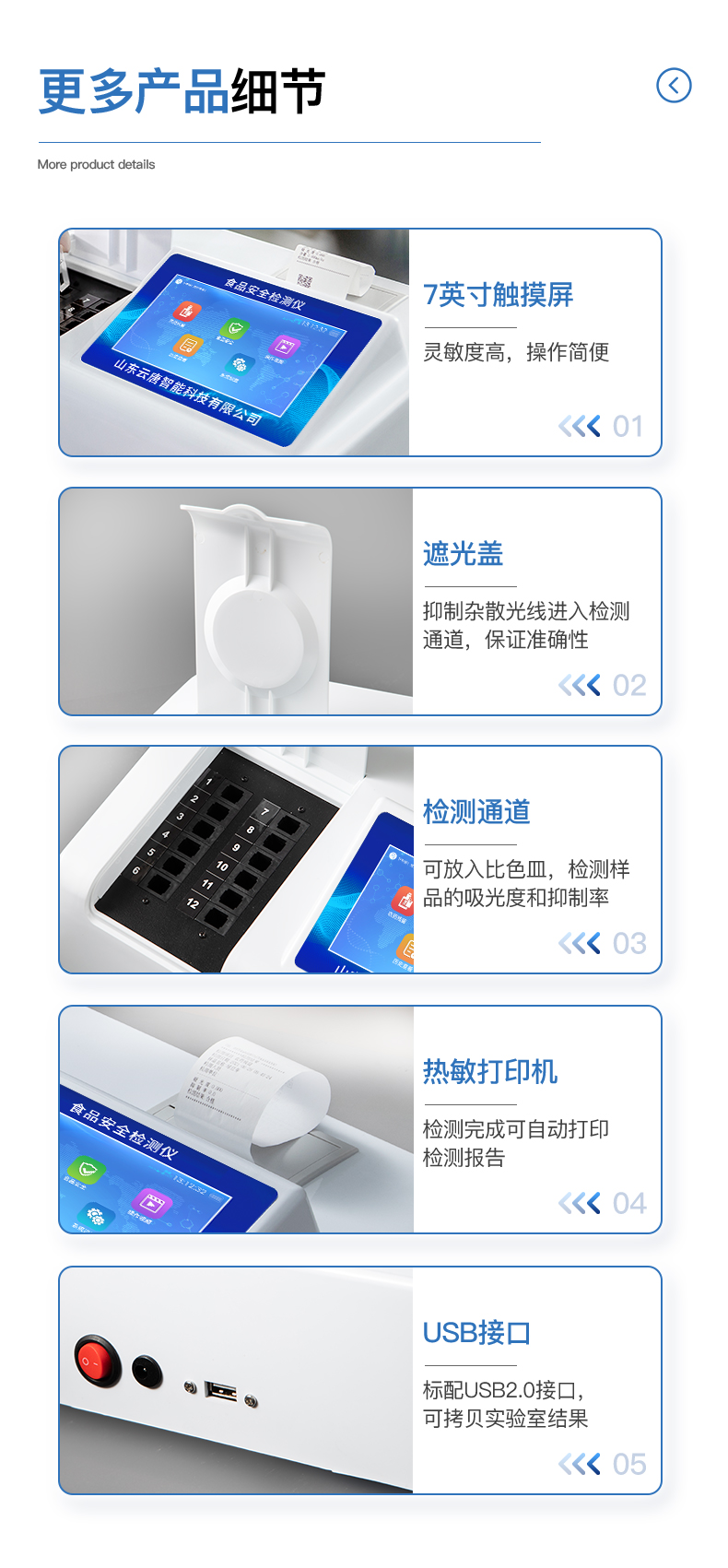 可快速檢測病害肉、組胺、揮發(fā)性鹽基氮,儀器預留其他項目檢測程序和端口,根據(jù)日后需求可方便的自主增加檢測項目。