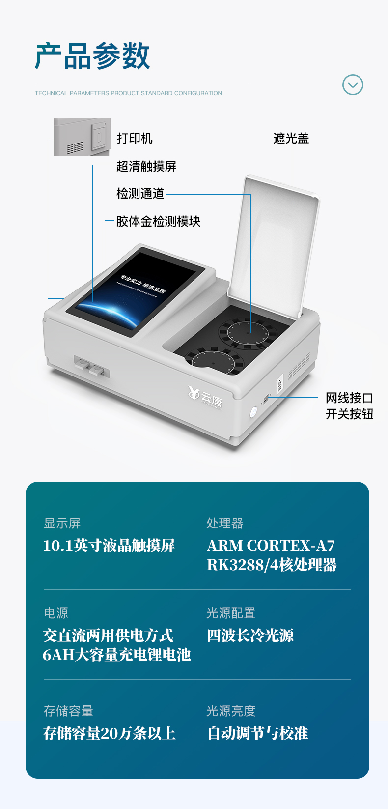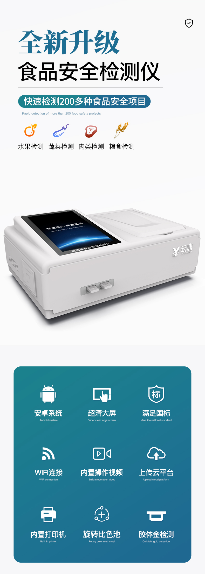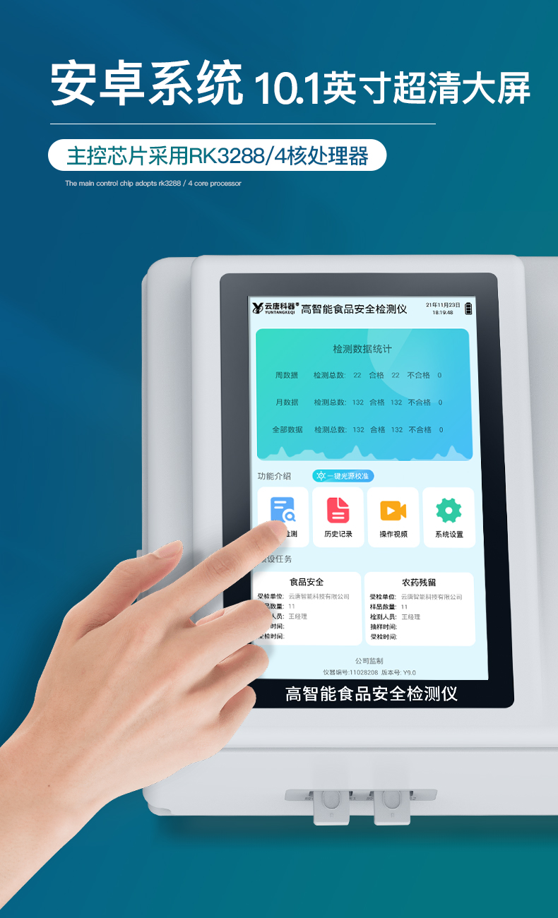| 1、儀器采用臺(tái)式一體化系統(tǒng)檢測(cè)技術(shù),將分光光度模塊、膠體金檢測(cè)模塊、新型農(nóng)殘檢測(cè)模塊、數(shù)字化管理模塊、無(wú)線通訊模塊高度集成于一體,支持檢測(cè)200種食品安全檢測(cè)項(xiàng)目,同時(shí)預(yù)留升級(jí)檢測(cè)方法。 | 2、儀器檢測(cè)模塊標(biāo)準(zhǔn)化、智能化,檢測(cè)項(xiàng)目可隨意自由組合。檢測(cè)箱體內(nèi)置多個(gè)標(biāo)準(zhǔn)檢測(cè)單元,檢測(cè)模塊可以調(diào)整配置。 | 3、顯示屏幕:儀器采用10.1英寸豎向液晶觸摸屏顯,搭配運(yùn)行安卓智能操作系統(tǒng),主控芯片采用ARM Cortex-A7,RK3288/4核處理器,主頻1.88Ghz,操作方便,性能更強(qiáng)。 | 4、檢測(cè)通道:≥12通道;采用精密旋轉(zhuǎn)比色池設(shè)計(jì),使用同芯片同光源校準(zhǔn)精度,解決不同光源之間的誤差值,更加準(zhǔn)確**。(1-12通道間誤差0.1%,***:**202022821055.2) | 5、儀器光源:高精度進(jìn)口四波長(zhǎng)冷光源,每個(gè)通道均配置 410、520、590、630nm 波長(zhǎng)光源,標(biāo)配**的光路切換裝置,專利光路切換功能可實(shí)現(xiàn)64波長(zhǎng),并且所有檢測(cè)項(xiàng)目可實(shí)現(xiàn)所有通道同時(shí)檢測(cè)。 | 6、設(shè)備可一鍵校準(zhǔn),自動(dòng)保存校準(zhǔn)數(shù)據(jù),自動(dòng)對(duì)比校驗(yàn),得到精準(zhǔn)光源,采用Android SP存儲(chǔ)數(shù)據(jù),光源數(shù)據(jù)永不丟失,方便每一次使用。 | 7、通訊接口:配備無(wú)線通信模塊、4G(APN)通訊模塊、藍(lán)牙傳輸,同時(shí)具有雙USB接口以及RJ45網(wǎng)線接口,可以多方式實(shí)現(xiàn)數(shù)據(jù)保存及數(shù)據(jù)傳輸。 | 8、存儲(chǔ)方式:支持U盤存儲(chǔ),標(biāo)準(zhǔn)USB接口,免驅(qū)動(dòng)安裝。檢測(cè)結(jié)果存儲(chǔ)容量20萬(wàn)條以上,可生成Excel表格進(jìn)行拷貝,并具有登錄保護(hù)功能。 | 9、智能化操作系統(tǒng): | 9.1、操作系統(tǒng):儀器可在同一檢測(cè)界面自動(dòng)對(duì)應(yīng)相關(guān)檢測(cè)通道,一次性選擇1-12個(gè)樣品名稱,無(wú)需退出界面,節(jié)省操作時(shí)間。并可以對(duì)每個(gè)通道屬性和樣品信息單獨(dú)進(jìn)行編輯,例如送檢單位、人員,檢測(cè)人員等,打印時(shí)勾選打印顯示。 | 9.2、數(shù)據(jù)集成系統(tǒng):設(shè)備首頁(yè)自動(dòng)匯總分析檢測(cè)數(shù)據(jù),包含:周檢測(cè)數(shù)據(jù)、月檢測(cè)數(shù)據(jù),全部檢測(cè)總數(shù)量,均包含檢測(cè)總數(shù),合格數(shù),不合格數(shù),以及相關(guān)柱形分析圖,各項(xiàng)檢測(cè)數(shù)據(jù)一目了然,無(wú)需電腦查詢,更加快捷直觀。 | 9.3、數(shù)據(jù)庫(kù)系統(tǒng):十幾項(xiàng)數(shù)據(jù)庫(kù)分類管理儀器:包含項(xiàng)目類型、項(xiàng)目數(shù)據(jù)、檢測(cè)數(shù)據(jù)、歷史記錄、國(guó)標(biāo)信息、曲線信息、采樣信息、檢測(cè)信息、受檢信息、復(fù)核信息、圖表信息、光源校準(zhǔn)信息、打印樣式信息、樣品庫(kù)信息等等,數(shù)據(jù)庫(kù)之間互相協(xié)調(diào)聯(lián)動(dòng)保證數(shù)據(jù)的真實(shí)完整性。同時(shí)產(chǎn)品數(shù)據(jù)庫(kù)以及歷史檢測(cè)記錄支持一鍵檢索功能。 | 9.4、限量規(guī)判系統(tǒng):具有限量查詢、添加物質(zhì)合規(guī)判定系統(tǒng)。檢測(cè)出結(jié)果后,系統(tǒng)自動(dòng)調(diào)用系統(tǒng)數(shù)據(jù)庫(kù)中相關(guān)國(guó)標(biāo)進(jìn)行比對(duì)判定,客觀顯示判定結(jié)果是否合格。 | 9.5、項(xiàng)目預(yù)設(shè)系統(tǒng):儀器具有任務(wù)預(yù)設(shè)模塊,一鍵提前預(yù)設(shè),給出方便快捷的新檢測(cè)方案,每一個(gè)任務(wù)分別可以設(shè)置不同的樣品、批次、編號(hào)、來(lái)源、備注、抽樣信息、檢測(cè)信息、受檢信息、復(fù)核信息等更多信息。樣品送檢時(shí)一鍵調(diào)取保存信息,并可多次調(diào)取,大大提高檢測(cè)效率。 | 9.6、數(shù)據(jù)監(jiān)管系統(tǒng):同步對(duì)接監(jiān)管平臺(tái),數(shù)據(jù)可局域網(wǎng)和互聯(lián)網(wǎng)數(shù)據(jù)上傳,檢測(cè)結(jié)果可選擇直接傳至食品安全監(jiān)管平臺(tái)。進(jìn)行區(qū)域食品安全監(jiān)管及大數(shù)據(jù)分析處理與數(shù)據(jù)統(tǒng)計(jì),檢測(cè)區(qū)域食品安全長(zhǎng)短期動(dòng)態(tài),達(dá)到食品安全問(wèn)題預(yù)估、預(yù)警。 | 9.7.1、全新打印系統(tǒng):內(nèi)置全新打印機(jī),新創(chuàng)自定義打印方式,可按需靈活勾選控制:產(chǎn)品合格證(國(guó)家農(nóng)業(yè)部標(biāo)準(zhǔn)要求),二維碼,抽樣信息、檢測(cè)信息,受檢信息、復(fù)核信息、抽樣日期、檢測(cè)日期等信息的打印。 | 9.7.2、A4紙版本報(bào)告打印功能(選配):設(shè)備擁有兩種結(jié)果展示方式,可以自動(dòng)生成A4打印模板和小票打印模板兩種樣式,可通過(guò)WiFi及網(wǎng)線等方式鏈接外置打印機(jī)可進(jìn)行打印。 | 10、供電模式:儀器交直流兩用,直流12V供電,可連接車載電源,可配6ah大容量充電鋰電池,電量可實(shí)時(shí)顯示,方便戶外流動(dòng)測(cè)試。 | 11、膠體金檢測(cè)模塊:采用單通道CMOS成像處理技術(shù)及膠體金免疫層析技術(shù),可讀取膠體金卡數(shù)據(jù),自動(dòng)采集、處理分析,將檢