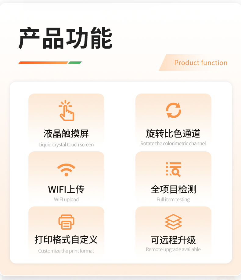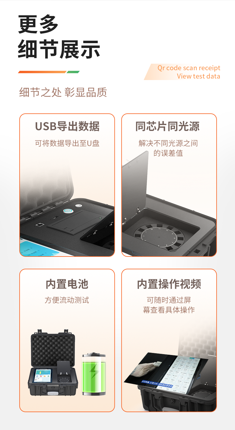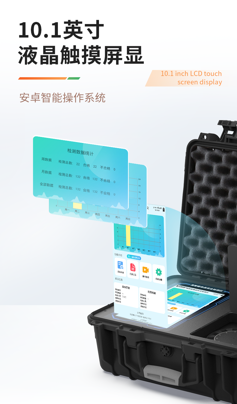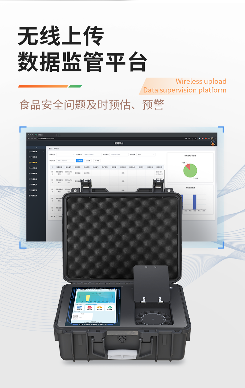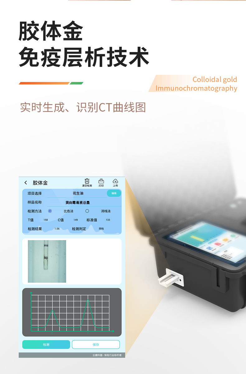 1、儀器采用手提一體化系統(tǒng)檢測(cè)技術(shù),將分光光度模塊、膠體金檢測(cè)模塊、新型農(nóng)殘檢測(cè)模塊、數(shù)字化管理模塊、無線通訊模塊高度集成于一體,支持檢測(cè)200種食品安全檢測(cè)項(xiàng)目,同時(shí)預(yù)留升級(jí)檢測(cè)方法。2、儀器檢測(cè)模塊標(biāo)準(zhǔn)化、智能化,檢測(cè)項(xiàng)目可隨意自由組合。檢測(cè)箱體內(nèi)置多個(gè)標(biāo)準(zhǔn)檢測(cè)單元,檢測(cè)模塊可以調(diào)整配置。3、顯示屏幕:儀器采用10.1英寸豎向液晶觸摸屏顯,搭配運(yùn)行安卓智能操作系統(tǒng),主控芯片采用ARM Cortex-A7,RK3288/4核處理器,主頻1.88Ghz,操作方便,性能更強(qiáng)。4、檢測(cè)通道:≥12通道;采用精密旋轉(zhuǎn)比色池設(shè)計(jì),使用同芯片同光源校準(zhǔn)精度,解決不同光源之間的誤差值,更加準(zhǔn)確**。(1-12通道間誤差0.1%,***:**202022821055.2)5、儀器光源:高精度進(jìn)口四波長(zhǎng)冷光源,每個(gè)通道均配置 410、520、590、630nm 波長(zhǎng)光源,標(biāo)配**的光路切換裝置,專利光路切換功能可實(shí)現(xiàn)64波長(zhǎng),并且所有檢測(cè)項(xiàng)目可實(shí)現(xiàn)所有通道同時(shí)檢測(cè)。6、設(shè)備可一鍵校準(zhǔn),自動(dòng)保存校準(zhǔn)數(shù)據(jù),自動(dòng)對(duì)比校驗(yàn),得到精準(zhǔn)光源,采用Android SP存儲(chǔ)數(shù)據(jù),光源數(shù)據(jù)永不丟失,方便每一次使用。7、通訊接口:配備無線通信模塊、4G(APN)通訊模塊、藍(lán)牙傳輸,同時(shí)具有雙USB接口以及RJ45網(wǎng)線接口,可以多方式實(shí)現(xiàn)數(shù)據(jù)保存及數(shù)據(jù)傳輸。8、存儲(chǔ)方式:支持U盤存儲(chǔ),標(biāo)準(zhǔn)USB接口,免驅(qū)動(dòng)安裝。檢測(cè)結(jié)果存儲(chǔ)容量20萬條以上,可生成Excel表格進(jìn)行拷貝,并具有登錄保護(hù)功能。9、智能化操作系統(tǒng):9.1、操作系統(tǒng):儀器可在同一檢測(cè)界面自動(dòng)對(duì)應(yīng)相關(guān)檢測(cè)通道,一次性選擇1-12個(gè)樣品名稱,無需退出界面,節(jié)省操作時(shí)間。并可以對(duì)每個(gè)通道屬性和樣品信息單獨(dú)進(jìn)行編輯,例如送檢單位、人員,檢測(cè)人員等,打印時(shí)勾選打印顯示。9.2、數(shù)據(jù)集成系統(tǒng):設(shè)備首頁自動(dòng)匯總分析檢測(cè)數(shù)據(jù),包含:周檢測(cè)數(shù)據(jù)、月檢測(cè)數(shù)據(jù),全部檢測(cè)總數(shù)量,包含檢測(cè)總數(shù),合格數(shù),不合格數(shù),以及相關(guān)柱形分析圖,各項(xiàng)檢測(cè)數(shù)據(jù)一目了然,無需電腦查詢,更加快捷直觀。9.3、數(shù)據(jù)庫系統(tǒng):十幾項(xiàng)數(shù)據(jù)庫分類管理儀器:包含項(xiàng)目類型、項(xiàng)目數(shù)據(jù)、檢測(cè)數(shù)據(jù)、歷史記錄、國(guó)標(biāo)信息、曲線信息、采樣信息、檢測(cè)信息、受檢信息、復(fù)核信息、圖表信息、光源校準(zhǔn)信息、打印樣式信息、樣品庫信息等等,數(shù)據(jù)庫之間互相協(xié)調(diào)聯(lián)動(dòng)保證數(shù)據(jù)的真實(shí)完整性。同時(shí)產(chǎn)品數(shù)據(jù)庫以及歷史檢測(cè)記錄支持一鍵檢索功能。9.4、限量規(guī)判系統(tǒng):具有限量查詢、添加物質(zhì)合規(guī)判定系統(tǒng)。檢測(cè)出結(jié)果后,系統(tǒng)自動(dòng)調(diào)用系統(tǒng)數(shù)據(jù)庫中相關(guān)國(guó)標(biāo)進(jìn)行比對(duì)判定,客觀顯示判定結(jié)果是否合格。9.5、項(xiàng)目預(yù)設(shè)系統(tǒng):儀器具有任務(wù)預(yù)設(shè)模塊,一鍵提前預(yù)設(shè),給出方便快捷的新檢測(cè)方案,每一個(gè)任務(wù)分別可以設(shè)置不同的樣品、批次、編號(hào)、來源、備注、抽樣信息、檢測(cè)信息、受檢信息、復(fù)核信息等更多信息。樣品送檢時(shí)一鍵調(diào)取保存信息,并可多次調(diào)取,大大提高檢測(cè)效率。9.6、數(shù)據(jù)監(jiān)管系統(tǒng):同步對(duì)接監(jiān)管平臺(tái),數(shù)據(jù)可局域網(wǎng)和互聯(lián)網(wǎng)數(shù)據(jù)上傳,檢測(cè)結(jié)果可直接傳至食品安全監(jiān)管平臺(tái)。進(jìn)行區(qū)域食品安全監(jiān)管及大數(shù)據(jù)分析處理與數(shù)據(jù)統(tǒng)計(jì),監(jiān)測(cè)區(qū)域食品安全長(zhǎng)短期動(dòng)態(tài)及問題預(yù)估、預(yù)警。9.7.1、全新打印系統(tǒng):內(nèi)置全新打印機(jī),新創(chuàng)自定義打印方式,可按需靈活勾選控制:產(chǎn)品合格證(國(guó)家農(nóng)業(yè)部標(biāo)準(zhǔn)要求),二維碼,抽樣信息、檢測(cè)信息,受檢信息、復(fù)核信息、抽樣日期、檢測(cè)日期等信息的打印。9.7.2、A4紙版本報(bào)告打印功能(可選配):設(shè)備擁有兩種結(jié)果展示方式,可以自動(dòng)生成A4打印模板和小票打印模板兩種樣式,可通過WiFi及網(wǎng)線等方式鏈接外置打印機(jī)可進(jìn)行打印。10、供電模式:儀器交直流兩用,直流12V供電,可連接車載電源,配6ah大容量充電鋰電池,電量可實(shí)時(shí)顯示,方便戶外流動(dòng)測(cè)試。11、膠體金檢測(cè)模塊:采用單通道CMOS成像處理技術(shù)及膠體金免疫層析技術(shù),可讀取膠體金卡數(shù)據(jù),自動(dòng)采集、處理分析,將檢測(cè)結(jié)果顯示,并可根據(jù)參考限值自動(dòng)判斷檢測(cè)結(jié)果,可檢測(cè)常見的獸藥殘留、生物毒素、抗生素、