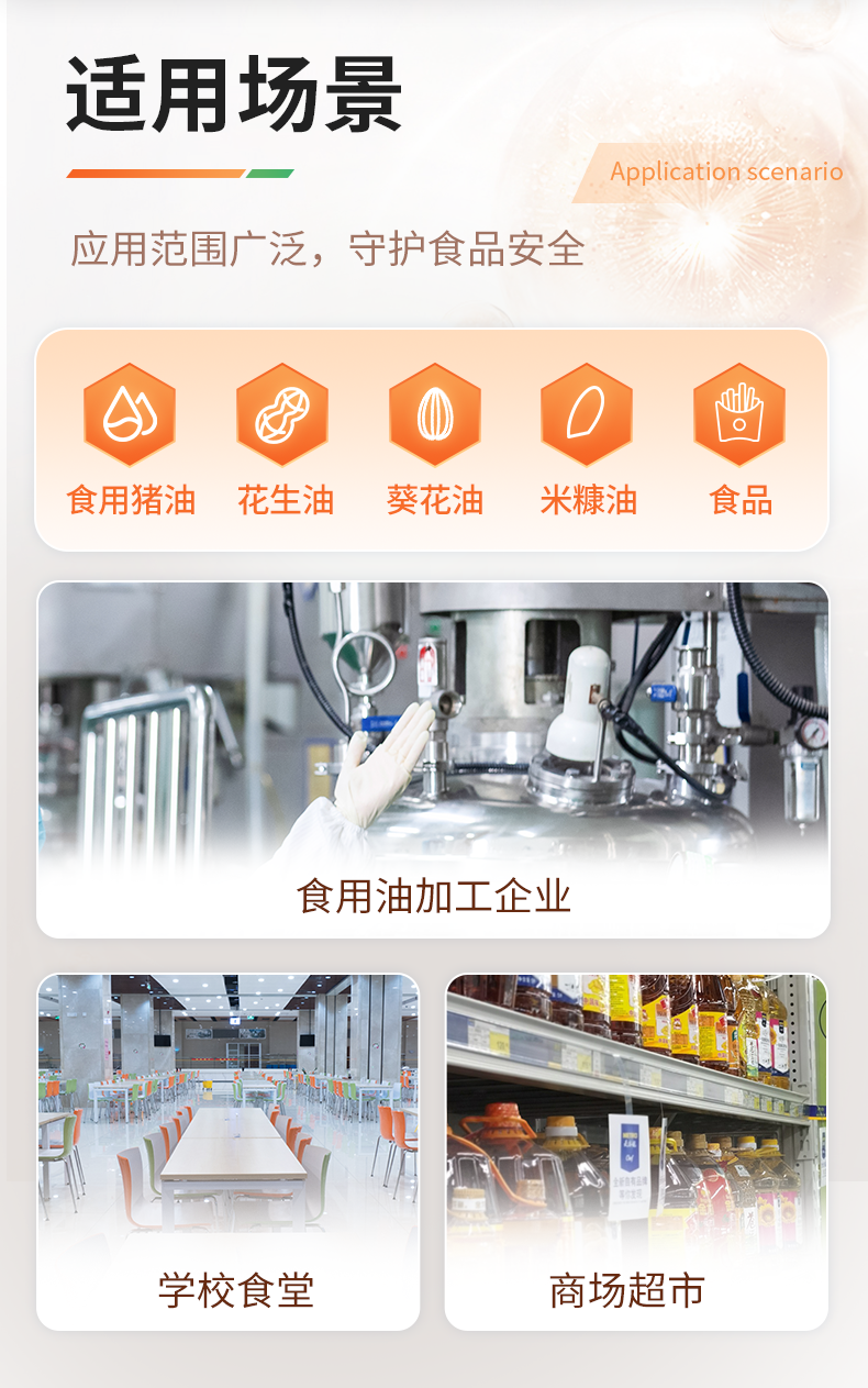 該食用油綜合檢測(cè)儀為集成化食品安全快速檢測(cè)分析設(shè)備,目前已于市場(chǎng)監(jiān)管局、食用油加工企業(yè)、學(xué)校食堂、衛(wèi)生部門、配送中心、商場(chǎng)超市等單位廣泛使用。。
