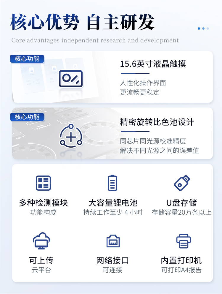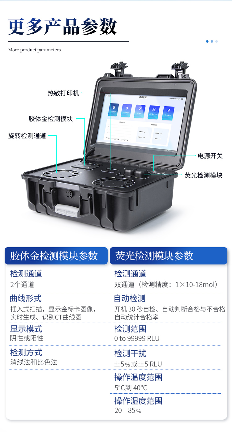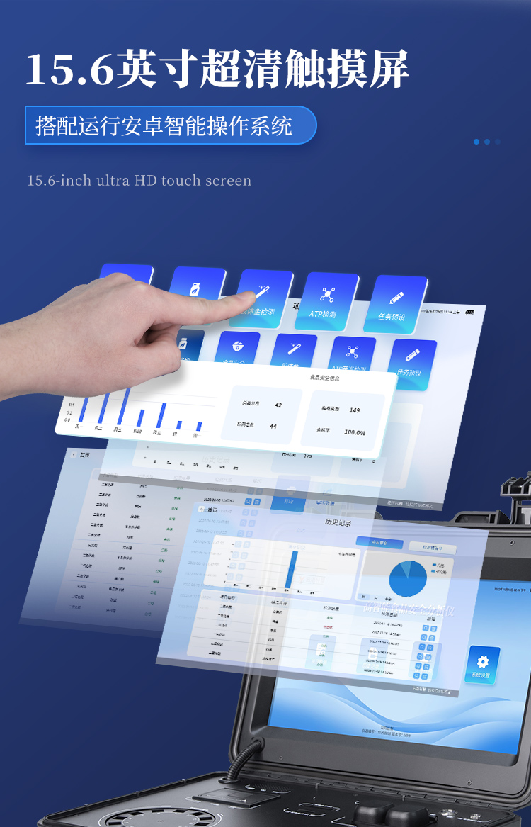 | 儀器采用臺(tái)式一體化系統(tǒng)檢測(cè)技術(shù),將分光光度模塊、數(shù)字化管理模塊、無線通訊模塊高度集成于一體,可支持檢測(cè)60種食品安全檢測(cè)項(xiàng)目,同時(shí)預(yù)留升級(jí)檢測(cè)方法。 | 儀器檢測(cè)模塊標(biāo)準(zhǔn)化、智能化,檢測(cè)項(xiàng)目可隨意自由組合。檢測(cè)箱體內(nèi)置多個(gè)標(biāo)準(zhǔn)檢測(cè)單元,檢測(cè)模塊可以調(diào)整配置。 | 儀器采用全新安卓智能系統(tǒng),主控芯片采用 ARM Cortex-A7,RK3288/4核處理器,10.1寸高清液晶觸摸豎屏,更加**的UI交互界面,運(yùn)轉(zhuǎn)快捷;儀器配備無線通信模塊: 4G(APN)通訊模塊、Wifi模塊,藍(lán)牙傳輸,同時(shí)具有雙USB接口以及RJ45接口能以多種方式實(shí)現(xiàn)數(shù)據(jù)保存和數(shù)據(jù)傳輸功能。 | 顯示屏幕:儀器采用10.1英寸豎向液晶觸摸屏顯,搭配運(yùn)行安卓智能操作系統(tǒng),主控芯片采用ARM Cortex-A7,RK3288/4核處理器,主頻1.88Ghz,操作方便,性能更強(qiáng)。 | 檢測(cè)通道:≥12通道;采用精密旋轉(zhuǎn)比色池設(shè)計(jì),使用同芯片同光源校準(zhǔn)精度,解決不同光源之間的誤差值,更加準(zhǔn)確**。(1-12通道間誤差0.1%,***:**202022821055.2) | 儀器光源:高精度進(jìn)口四波長(zhǎng)冷光源,每個(gè)通道均配置 410、520、590、630nm 波長(zhǎng)光源,標(biāo)配**的光路切換裝置,專利光路切換功能可實(shí)現(xiàn)64波長(zhǎng),并且所有檢測(cè)項(xiàng)目可實(shí)現(xiàn)所有通道同時(shí)檢測(cè)。 | 設(shè)備可一鍵校準(zhǔn),自動(dòng)保存校準(zhǔn)數(shù)據(jù),自動(dòng)對(duì)比校驗(yàn),得到精準(zhǔn)光源,采用Android SP存儲(chǔ)數(shù)據(jù),光源數(shù)據(jù)永不丟失,方便每一次使用。 | 通訊接口:配備無線通信模塊、4G(APN)通訊模塊、藍(lán)牙傳輸,同時(shí)具有雙USB接口以及RJ45網(wǎng)線接口,可以多方式實(shí)現(xiàn)數(shù)據(jù)保存及數(shù)據(jù)傳輸。 | 存儲(chǔ)方式:支持U盤存儲(chǔ),標(biāo)準(zhǔn)USB接口,免驅(qū)動(dòng)安裝。檢測(cè)結(jié)果存儲(chǔ)容量20萬條以上,可生成Excel表格進(jìn)行拷貝,并具有登錄保護(hù)功能。 | 智能化操作系統(tǒng): | 1、操作系統(tǒng):儀器可在同一檢測(cè)界面自動(dòng)對(duì)應(yīng)相關(guān)檢測(cè)通道,一次性選擇1-12個(gè)樣品名稱,無需退出界面,節(jié)省操作時(shí)間。并可以對(duì)每個(gè)通道屬性和樣品信息單獨(dú)進(jìn)行編輯,例如送檢單位、人員,檢測(cè)人員等,打印時(shí)勾選打印顯示。 | 2、數(shù)據(jù)集成系統(tǒng):設(shè)備首頁(yè)自動(dòng)匯總分析檢測(cè)數(shù)據(jù),包含:周檢測(cè)數(shù)據(jù)、月檢測(cè)數(shù)據(jù),全部檢測(cè)總數(shù)量,均包含檢測(cè)總數(shù),合格數(shù),不合格數(shù),以及相關(guān)柱形分析圖,各項(xiàng)檢測(cè)數(shù)據(jù)一目了然,無需電腦查詢,更加快捷直觀。 | 3、數(shù)據(jù)庫(kù)系統(tǒng):十幾項(xiàng)數(shù)據(jù)庫(kù)分類管理儀器:包含項(xiàng)目類型、項(xiàng)目數(shù)據(jù)、檢測(cè)數(shù)據(jù)、歷史記錄、國(guó)標(biāo)信息、曲線信息、采樣信息、檢測(cè)信息、受檢信息、復(fù)核信息、圖表信息、光源校準(zhǔn)信息、打印樣式信息、樣品庫(kù)信息等等,數(shù)據(jù)庫(kù)之間互相協(xié)調(diào)聯(lián)動(dòng)保證數(shù)據(jù)的真實(shí)完整性。同時(shí)產(chǎn)品數(shù)據(jù)庫(kù)以及歷史檢測(cè)記錄支持一鍵檢索功能。 | 4、限量規(guī)判系統(tǒng):具有限量查詢、添加物質(zhì)合規(guī)判定系統(tǒng)。檢測(cè)出結(jié)果后,系統(tǒng)自動(dòng)調(diào)用系統(tǒng)數(shù)據(jù)庫(kù)中相關(guān)國(guó)標(biāo)進(jìn)行比對(duì)判定,客觀顯示判定結(jié)果是否合格。 | 5、項(xiàng)目預(yù)設(shè)系統(tǒng):儀器具有任務(wù)預(yù)設(shè)模塊,一鍵提前預(yù)設(shè),給出方便快捷的新檢測(cè)方案,每一個(gè)任務(wù)分別可以設(shè)置不同的樣品、批次、編號(hào)、來源、備注、抽樣信息、檢測(cè)信息、受檢信息、復(fù)核信息等更多信息。樣品送檢時(shí)一鍵調(diào)取保存信息,并可多次調(diào)取,大大提高檢測(cè)效率。 | 6、數(shù)據(jù)監(jiān)管系統(tǒng):同步對(duì)接監(jiān)管平臺(tái),數(shù)據(jù)可局域網(wǎng)和互聯(lián)網(wǎng)數(shù)據(jù)上傳,檢測(cè)結(jié)果可選擇直接傳至食品安全監(jiān)管平臺(tái)。進(jìn)行區(qū)域食品安全監(jiān)管及大數(shù)據(jù)分析處理與數(shù)據(jù)統(tǒng)計(jì),檢測(cè)區(qū)域食品安全長(zhǎng)短期動(dòng)態(tài),達(dá)到食品安全問題預(yù)估、預(yù)警。 | 7、全新打印系統(tǒng):內(nèi)置全新打印機(jī),新創(chuàng)自定義打印方式,可按需靈活勾選控制:二維碼,抽樣信息、檢測(cè)信息,受檢信息、復(fù)核信息、抽樣日期、檢測(cè)日期等信息的打印。 | 8、A4紙版本報(bào)告打印功能(可選配):設(shè)備擁有兩種結(jié)果展示方式,可以自動(dòng)生成A4打印模板和小票打印模板兩種樣式,可通過WiFi及網(wǎng)線等方式鏈接外置打印機(jī)可進(jìn)行打印。 | 供電模式:儀器交直流兩用,直流12V供電,可連接車載電源,可配6ah大容量充電鋰電池,電量可實(shí)時(shí)顯示,方便戶外流動(dòng)測(cè)試。 | 儀器具備遠(yuǎn)程升級(j